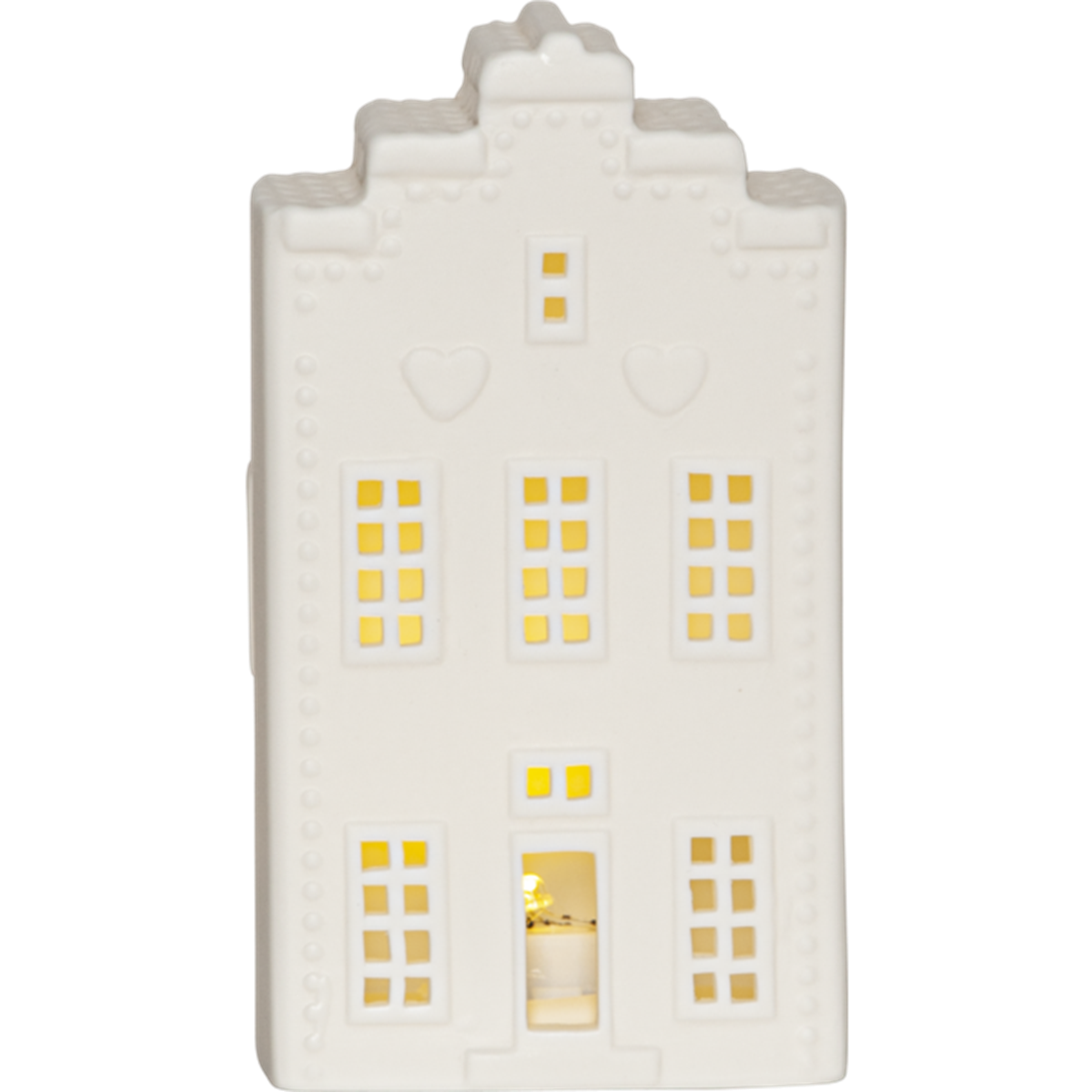 Ett vackert kanalhus i keramik för dekoration i hemmet. Lyser och sprider ett fint sken. För inomhusbruk. Timerfunktion. Drivs med 3 st AG13-batterier (medföljer).