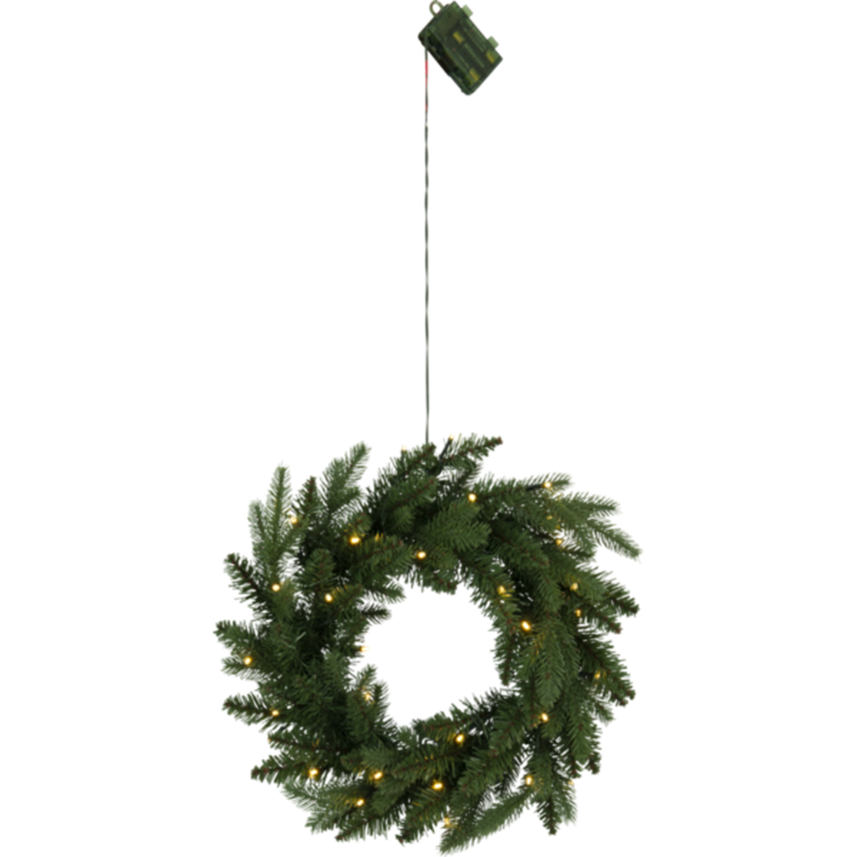 Krans med blandade tips som gör den fyllig. 30 varmvita LED-ljus som lyser upp när mörkret faller, Den inbyggda sensorn tänder kransen när det blir mörkt och släcker den när det ljusnar. Drivs med 3 st AA-batterier (ingår ej). Mått: 45x45 cm.