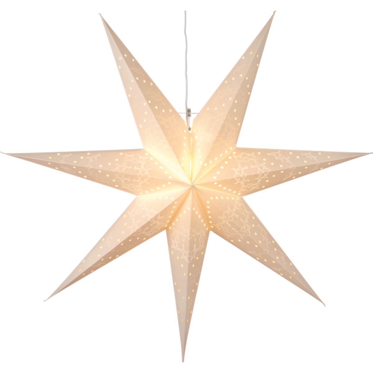 Mönstrad pappersstjärna i vit design. Fin stjärna att dekorera med i fönstret. Inkl. 3,5 m kabel, exkl. ljuskälla (E14). Mått: 70 x 70 cm.