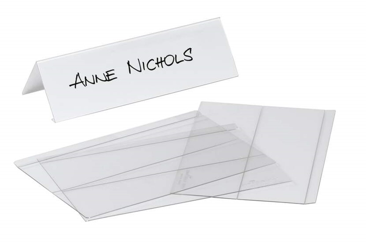 Smidig och flexibel bordsskylt för konferenser, sammanträden, prissättning, produktbeskrivningar m.m. Levereras ovikta och är perforerade för att enkelt kunna vikas. Läsbar från två håll. Tillverkad av PET-plast. Levereras med vita etiketter i 160 gr/m2 papper. Etiketter på A4-ark för utskrift i skrivare kan beställas separat. Använd gratisprogrammet DURAPRINT® som finns på www.duraprint.se för att skapa och skriva ut snygga namnetiketter. Mått: 61x210mm (HxB), platt 122x100 mm.