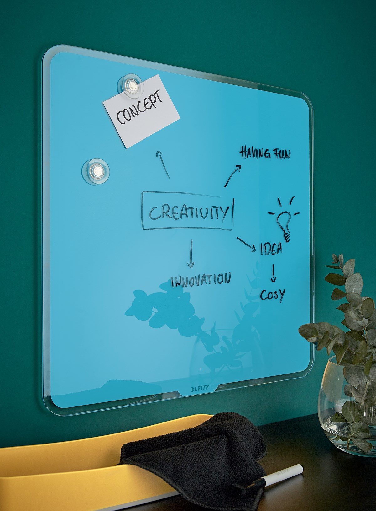 Känn dig som hemma vart än din arbetsdag tar dig med Cosy serien från Leitz. Med sin minimalistiska design och inbjudande färger kan du lägga till stil till din arbetsyta. Cosy magnetiska färgade Whiteboard är ett anteckningsverktyg som kan användas om och om igen, skriv helt enkelt med den medföljande penna, torka av och börja om. Denna whiteboard är ett perfekt komplement till ditt hem eller kontor för att hålla dig avslappnad och produktiv hela dagen. Kompakt, 45 x 45 cm whiteboard, perfekt för anteckningar och påminnelser. Skriv eller fäst dina anteckningar direkt på den magnetiska whiteboardytan. Ytan är gjord av härdat säkerhetsglas med mycket bra raderbarhet och hög motståndskraft mot bläckfläckar, pennmärken och repor. Lätt att installera med det dolda 4-hörnmonteringssystemet och monteringssatsen som ingår (2 skruvar och 2 pluggar).