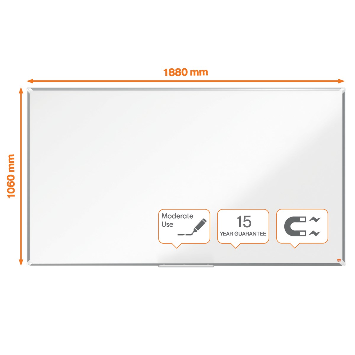 Modern snygg ramkant i aluminium runtom Fästes med en traditionell genomgående hörnmontering på väggen Stort pennfack för bekväm förvaring av whiteboardpennor och sudd Whiteboard yta med magnetiskt stål ger en ökad raderbarhet, för frekvent användning.