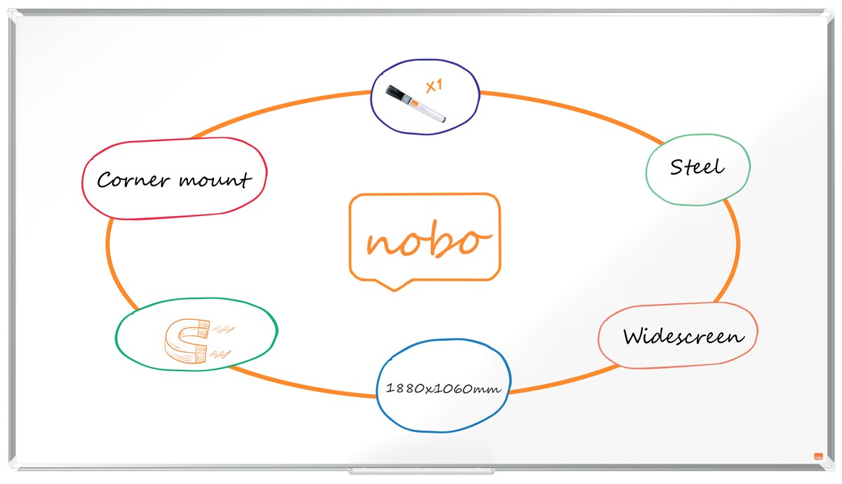 Magnetisk stål whiteboard i widescreen-format med en modern, elegant ramkant i aluminium. Fästes med genomgående hörnmontering och inkluderar ett stort pennfack för förvaring av whiteboardpennor och sudd. Den magnetiska whiteboardens målade stålyta ger en ökad raderbarhet för frekvent användning. En Nobo whiteboardpenna medföljer. 15 års garanti på ytan. EU Ecolabel certifierad, licensnummer PL/049/002/001.