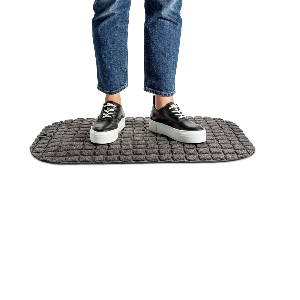 Hållbar och praktisk ståmatta i nätt format. Avlastar kroppen så att du kan stå och arbeta bekvämt, även längre stunder. Textil topp av 100% återvunnen PET, kärna av TPE och undersida av naturgummi. Pvc-fri. Öljett på kortsidan för upphängning. Grå. 780 x 540 mm. 16 mm tjock.
