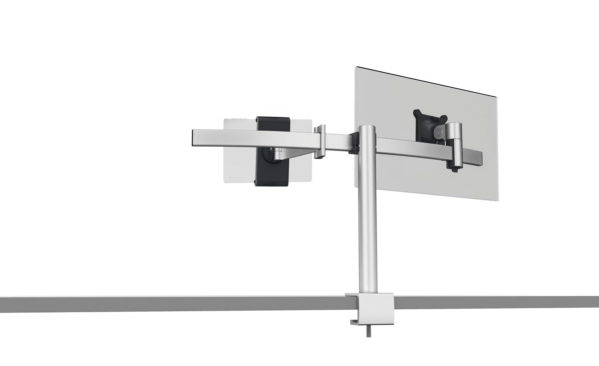 Skärmhållare för en datorskärm och en surfplatta. Består av ett lodrätt bordsstativ och en tvärgående arm med två skjutbara fästen. Skärmfästena går att låsa i vald position och sitter säkert fast när skärmarna höjdjusteras. Den tvärgående armen är justerbar i höjd 50-340 mm . Hållaren för surfplattan passar surfplattor från 7" till 13" och kan vridas 360° med fyra stopplägen vid varje 90°. Den är dessutom låsbar med en särskild nyckel för att förhindra att surfplattan tas bort. Fem kabelklämmor som kan placeras där det passar ingår - för att hålla ordning och reda på kablarna. Skärmarna är individuellt vinklingsbara 110 - 85° uppåt och 25° nedåt. Enkel att montera: bordsfäste för bordsskivor från 14 till 44 mm och skruvas fast med en insexnyckel som ingår. Mått: 780 x 445 x 190 mm (B x H x D).