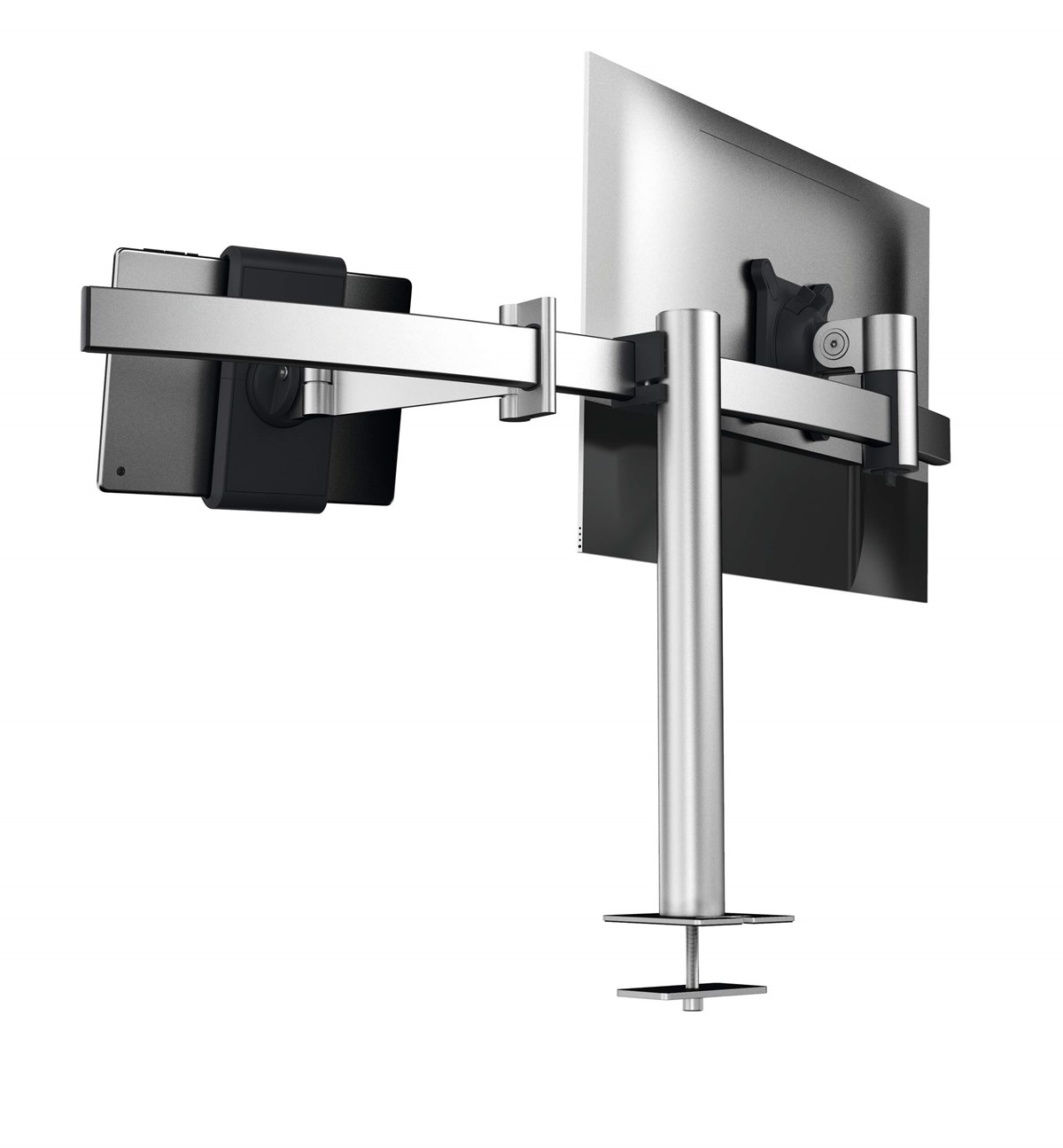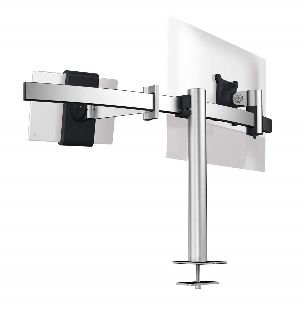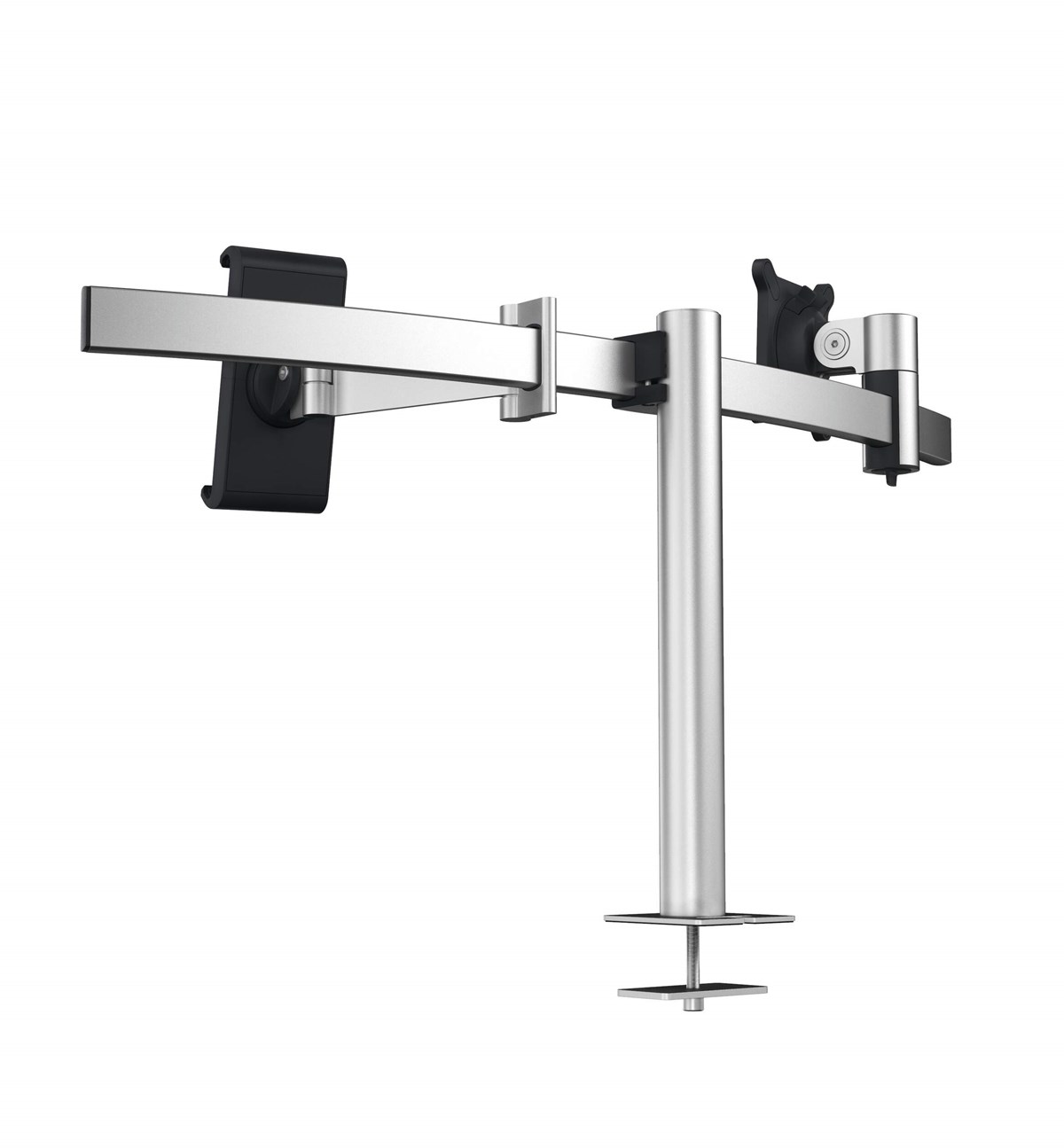 Skärmhållare för en datorskärm och en surfplatta. Består av ett lodrätt bordsstativ och en tvärgående arm med två skjutbara fästen. Skärmfästena går att låsa i vald position och sitter säkert fast när skärmarna höjdjusteras. Den tvärgående armen är justerbar i höjd 50-340 mm . Hållaren för surfplattan passar surfplattor från 7" till 13" och kan vridas 360° med fyra stopplägen vid varje 90°. Den är dessutom låsbar med en särskild nyckel för att förhindra att surfplattan tas bort. Fem kabelklämmor som kan placeras där det passar ingår - för att hålla ordning och reda på kablarna. Skärmarna är individuellt vinklingsbara 110 - 85° uppåt och 25° nedåt. Enkel att montera: kabelhålsfäste för bordsskivor med kabelhål 60-80 mm i diameter. Mått: 780 x 445 x 190 mm (B x H x D).