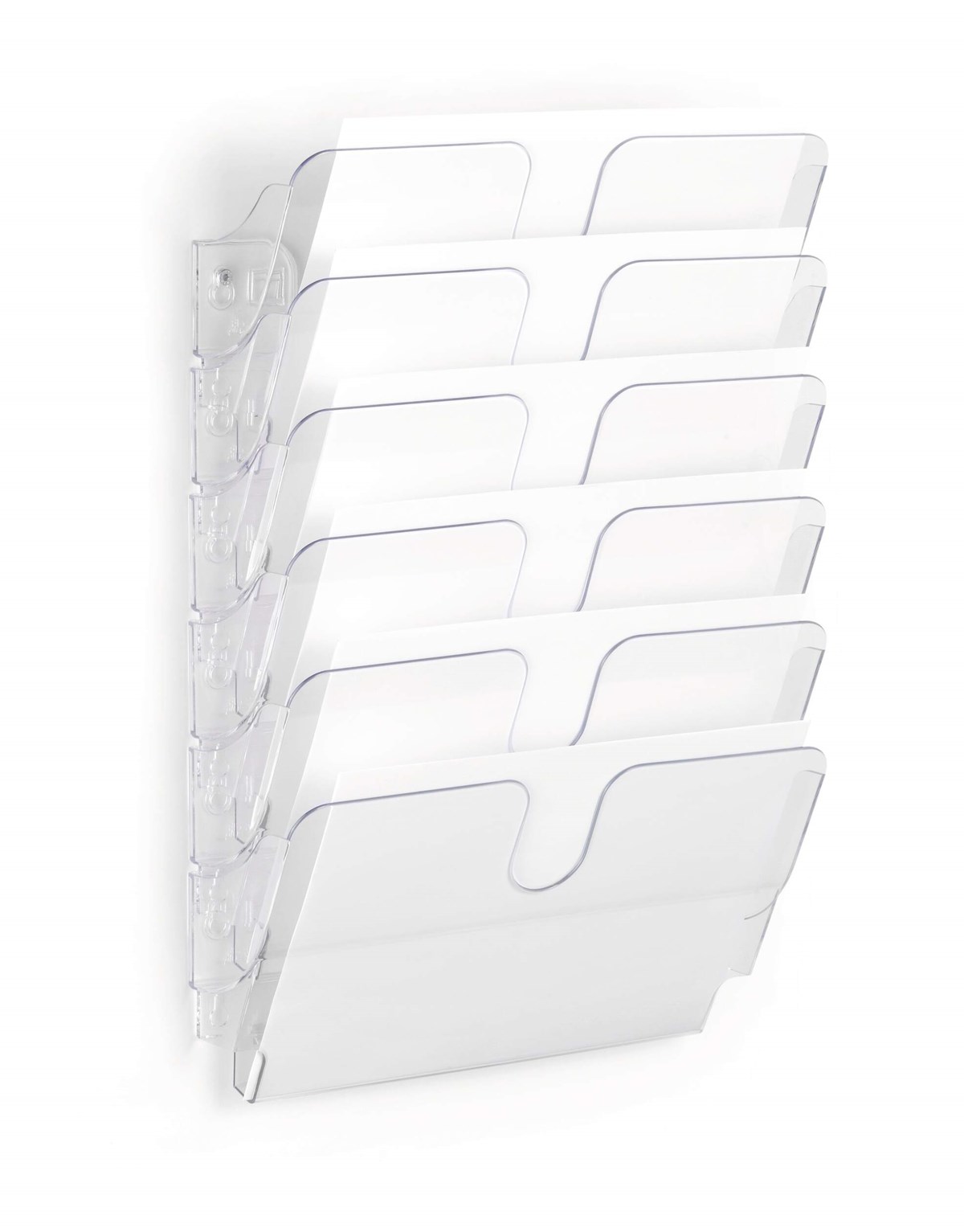 Blankettfack, broschyrställ, postfack - FLEXIPLUS är en serie med platsbesparande, flexibla och väggmonterade hållare för broschyrer, tidskrifter, blanketter och annan information i A4-format. Varje fack har en kapacitet på 24 mm tjocka buntar. Detta är ett komplett set med 6 fack i liggande format där facken kan monteras ihop eller användas var för sig.
