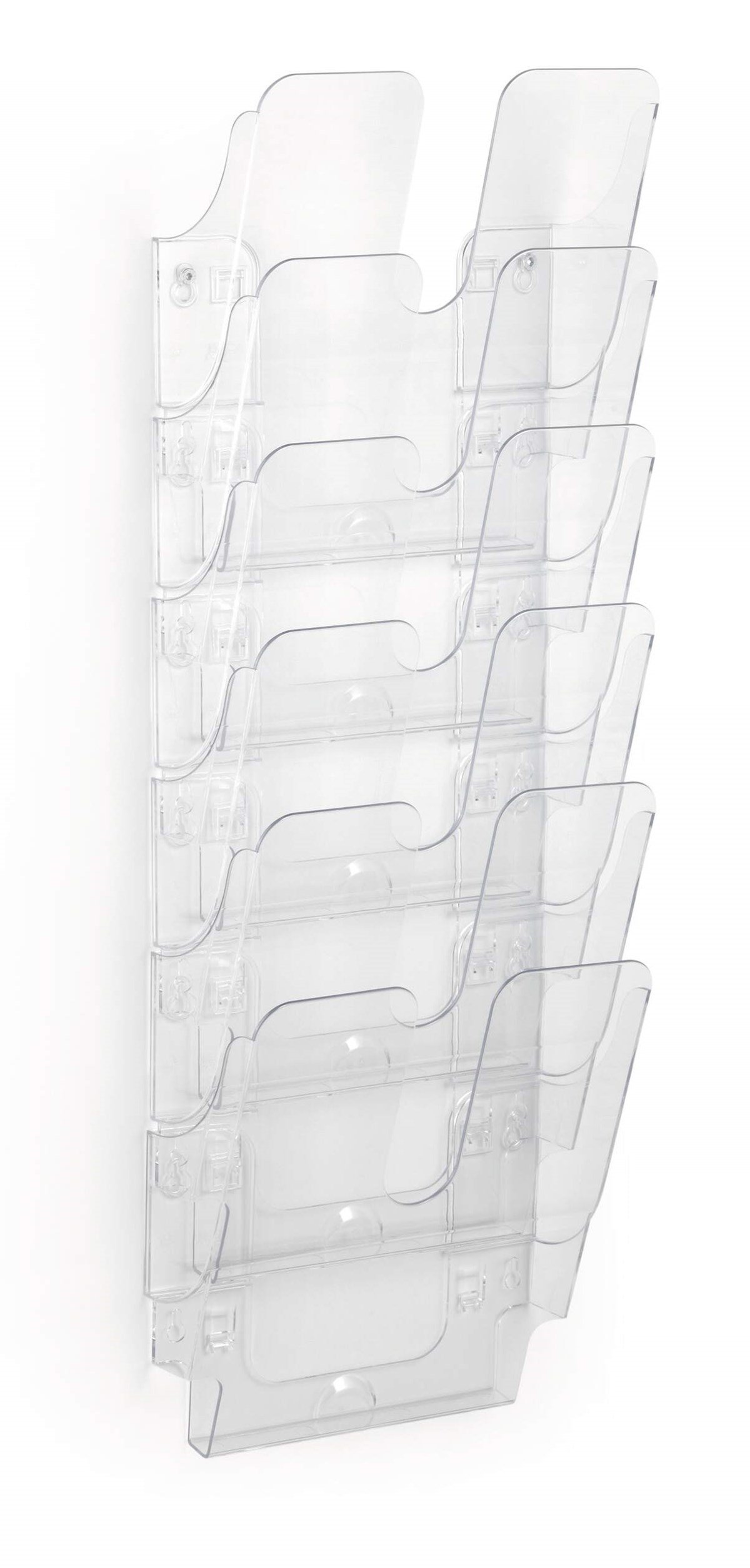Blankettfack, broschyrställ, postfack - FLEXIPLUS är en serie med platsbesparande, flexibla och väggmonterade hållare för broschyrer, tidskrifter, blanketter och annan information i A4-format. Varje fack har en kapacitet på 24 mm tjocka buntar. Detta är ett komplett set med 6 fack i stående format där facken kan monteras ihop eller användas var för sig.
