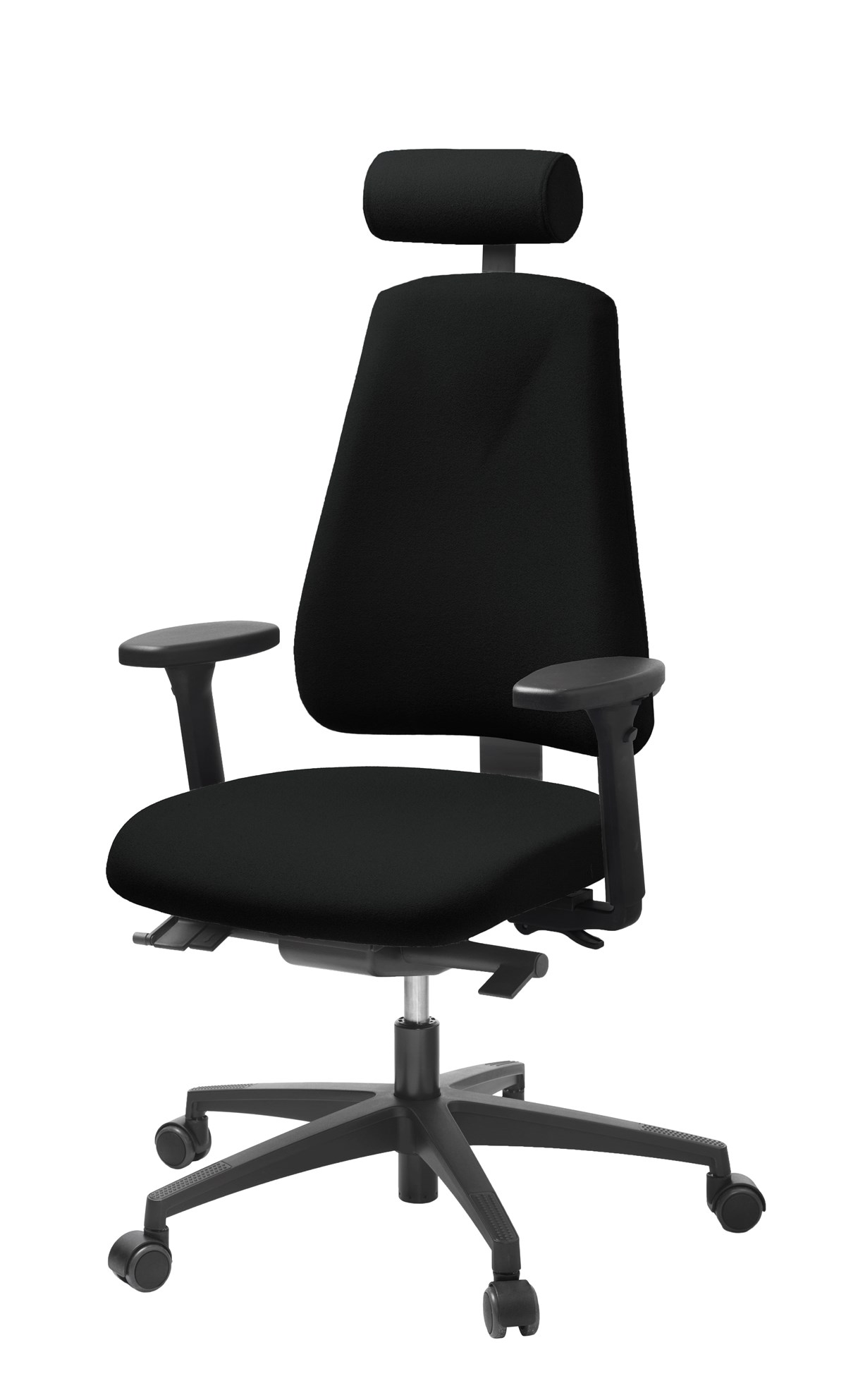 En klassiskt designad kontorsstol med många ergonomiska inställningsmöjligheter via logiskt placerade och lätthanterliga reglage.