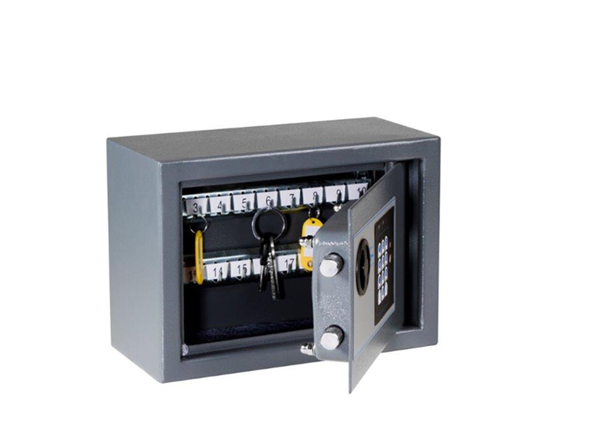 Nyckelskåp N20-H är ett nyckelskåp i en snygg design och tjockare stålplåt för bättre säkerhet. Dörren låses med tjockare reglar i sidan och har ett elektroniskt kodlås med handvred. Nyckelskåpen har en snygg grafitgrå färg. Skåpen även förberedda för att hängas på vägg samt de elektroniska kodlåset har en belyst display, vilket gör det extra tydligt att se. Nyckelskåp N20-H är bland annat populärt hos olika företag, organisationer men även inom vård & omsorg. I och med sin stilrena design så passar dem in i ett flertal andra miljöer. Exempelvis i sitt hem, verkstad, kontor, garage, lagerlokal, m.m. Utv. skåpsmått i mm H: 200 B: 280 D: 130.