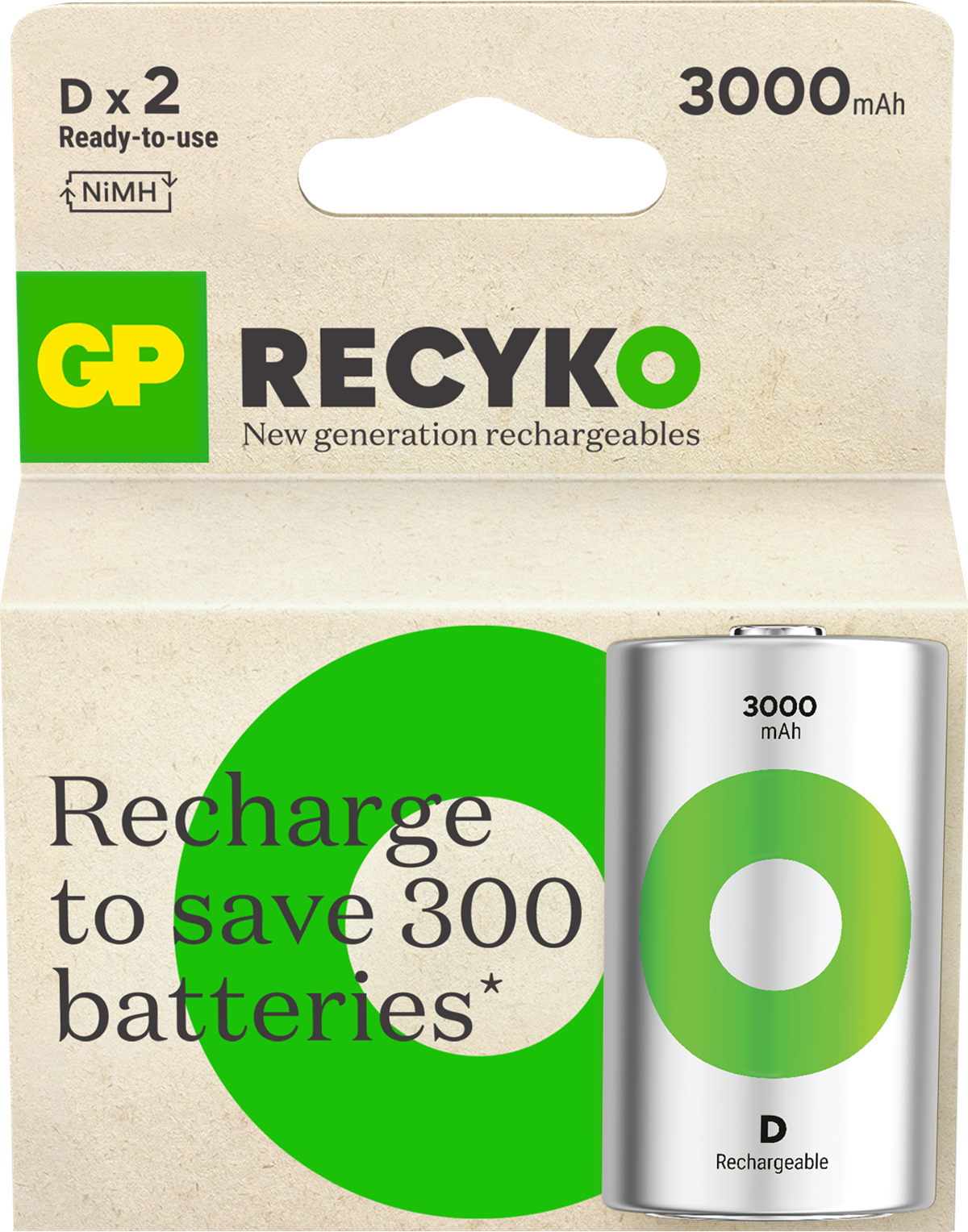 Recyko D 3000mAh batteri är ett kraftfullt laddningsbart NiMH batteri som är utvecklat för ditt vardagliga användande. De är laddade vid köp och redo att användas direkt ur förpackningen. Till skillnad från engångsbatterier så kan Recyko användas vid låga temperaturer, ända ned till - 20°C. Över 90% av batteriet, inklusive förpackning är återvinningsbart.