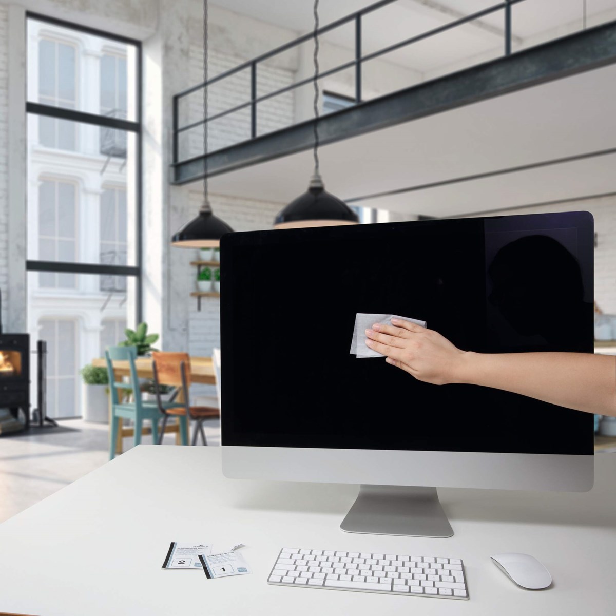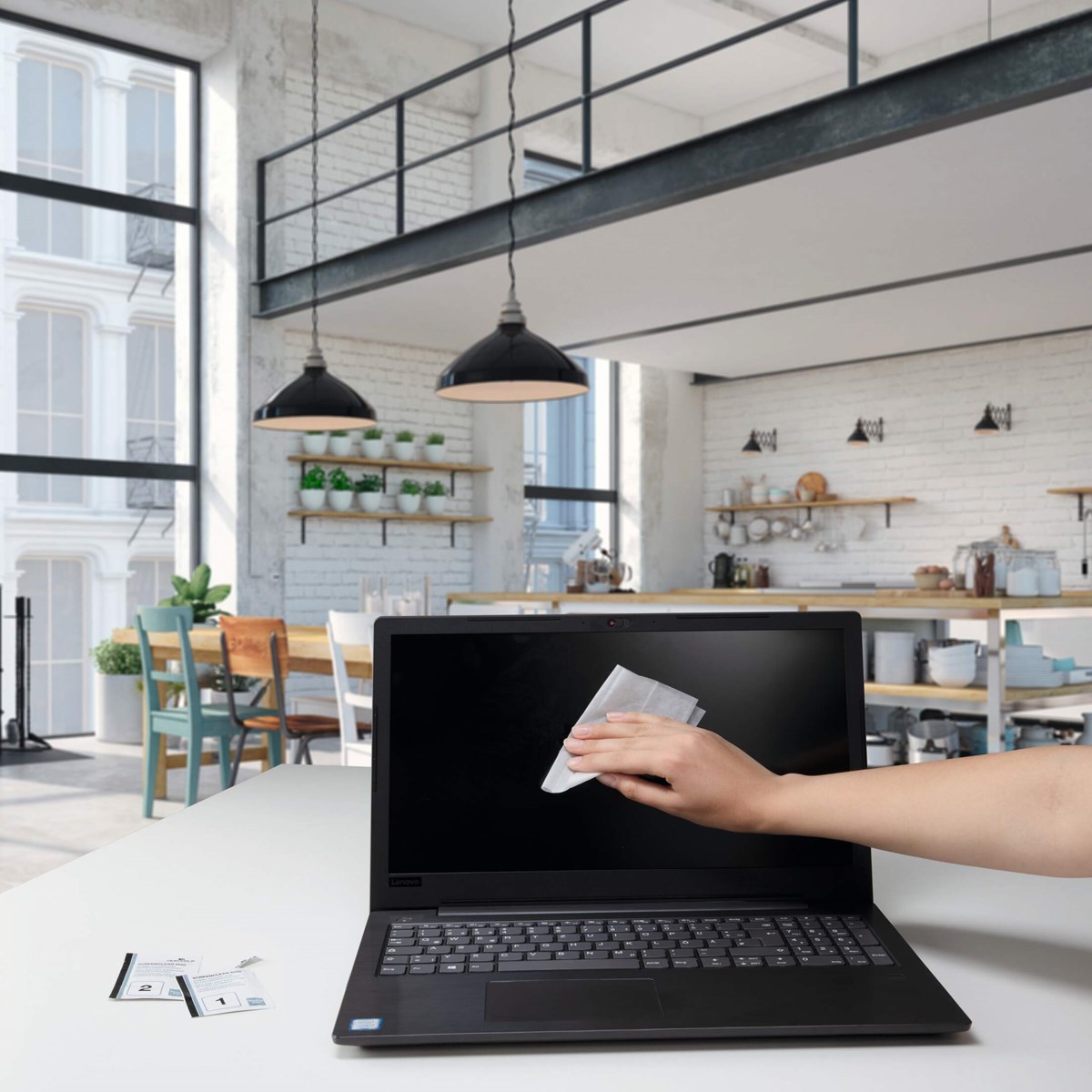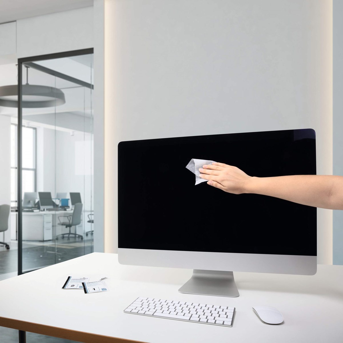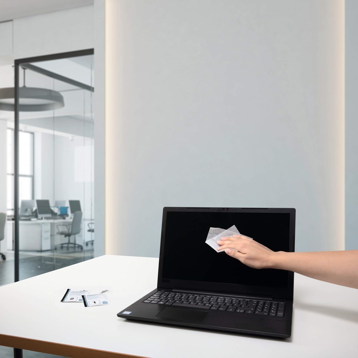 Styckförpackade våt- och torrdukar för rengöring av bildskärmar, bärbara datorer och glasytor på kopieringsmaskiner och skannrar. Rengör först med den fuktiga duken, eftertorka med den torra. Dukarna är biologiskt nedbrytbara och har antistatisk effekt. 10 set/förp.