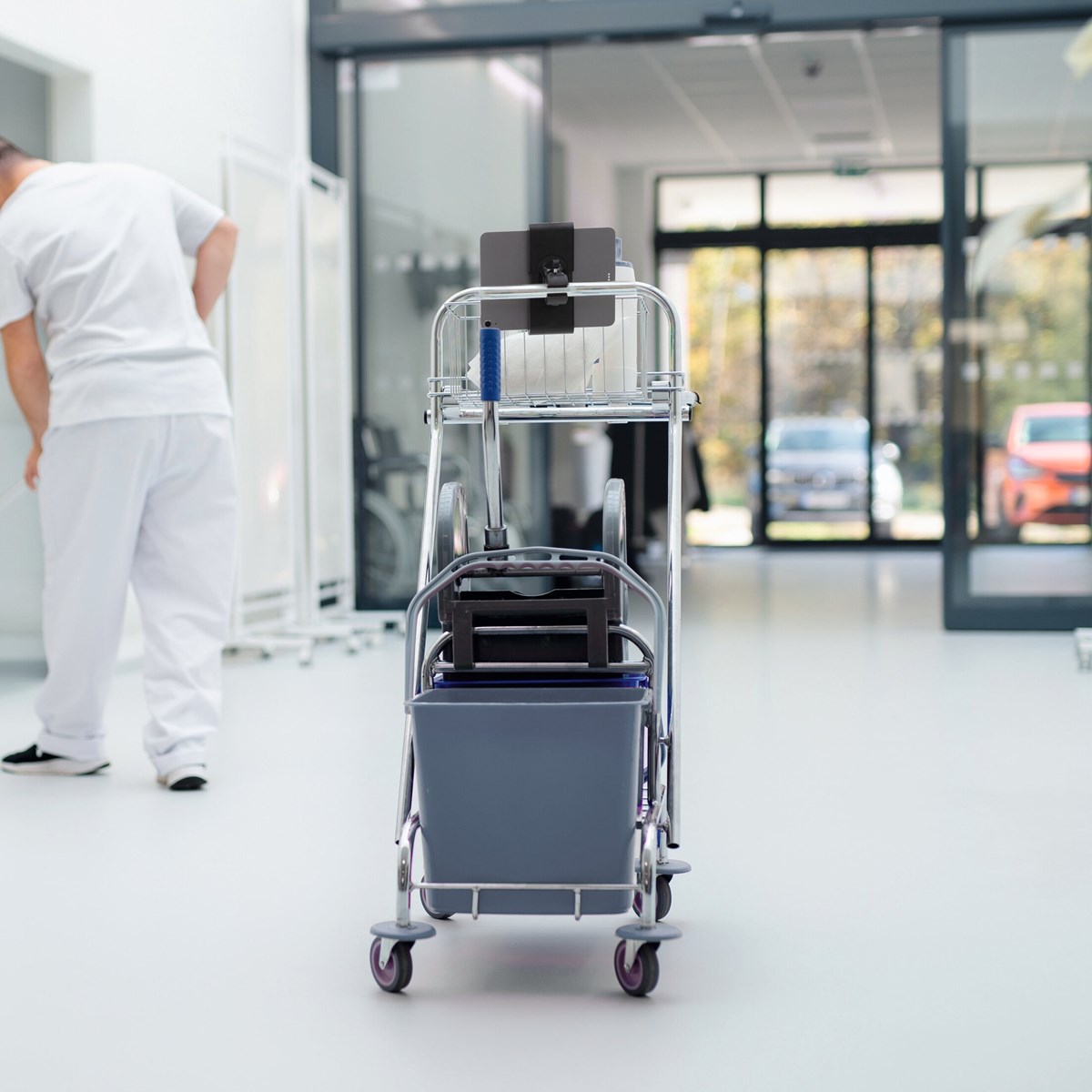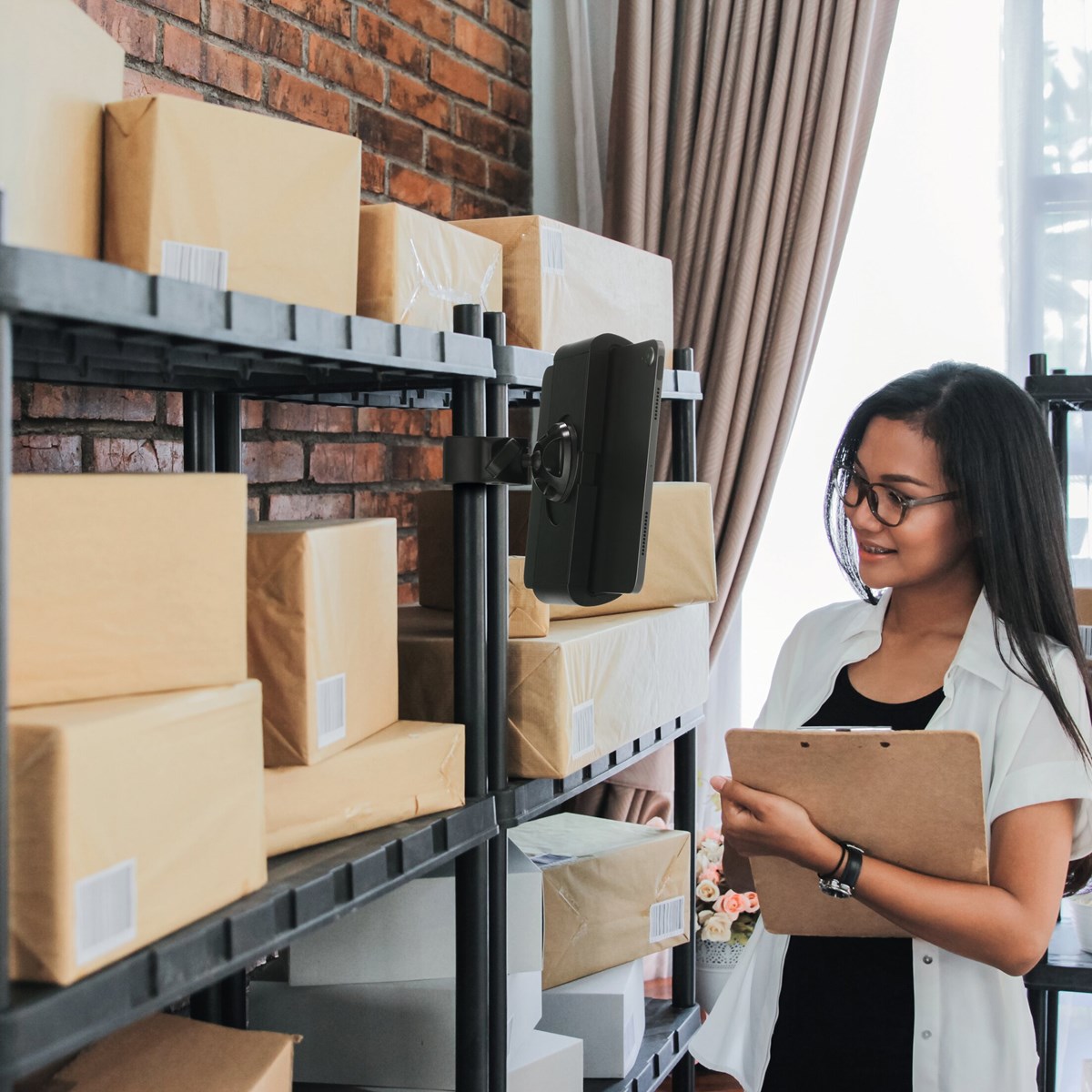 Denna surfplattehållare är perfekt för industriella miljöer som produktionsanläggningar, lager och städföretag. Den kan enkelt monteras på hyllplan (max 40 mm) eller rör och stänger (Ø 15-40 mm), till exempel handtaget på en vagn.