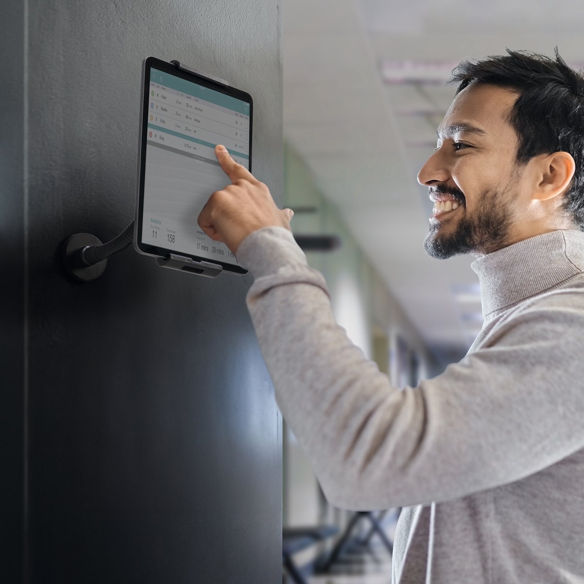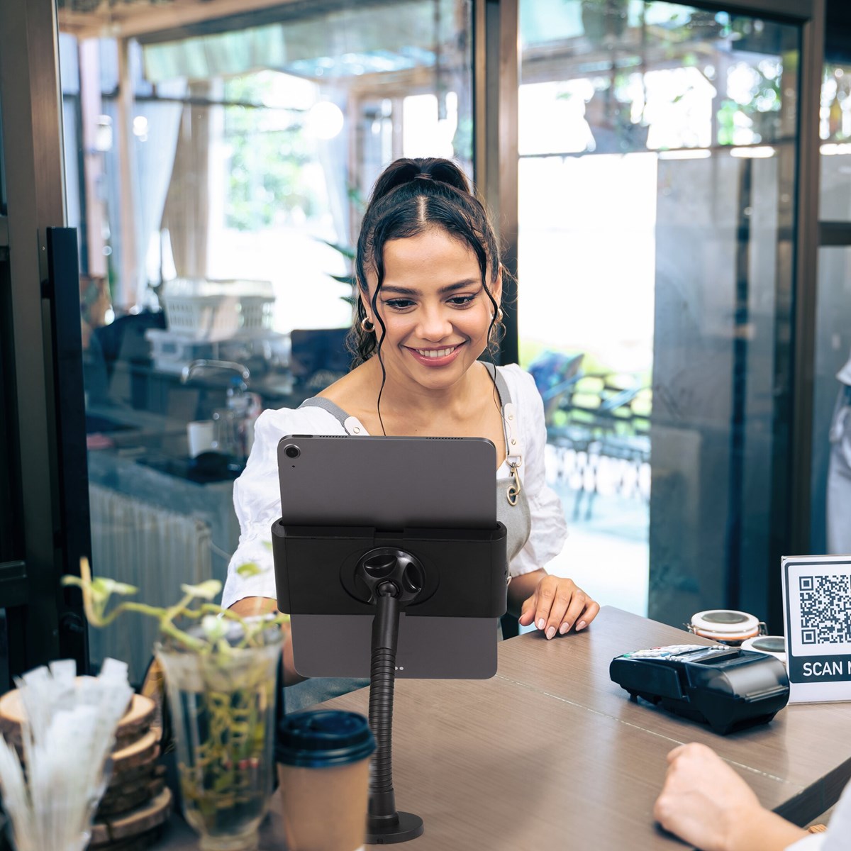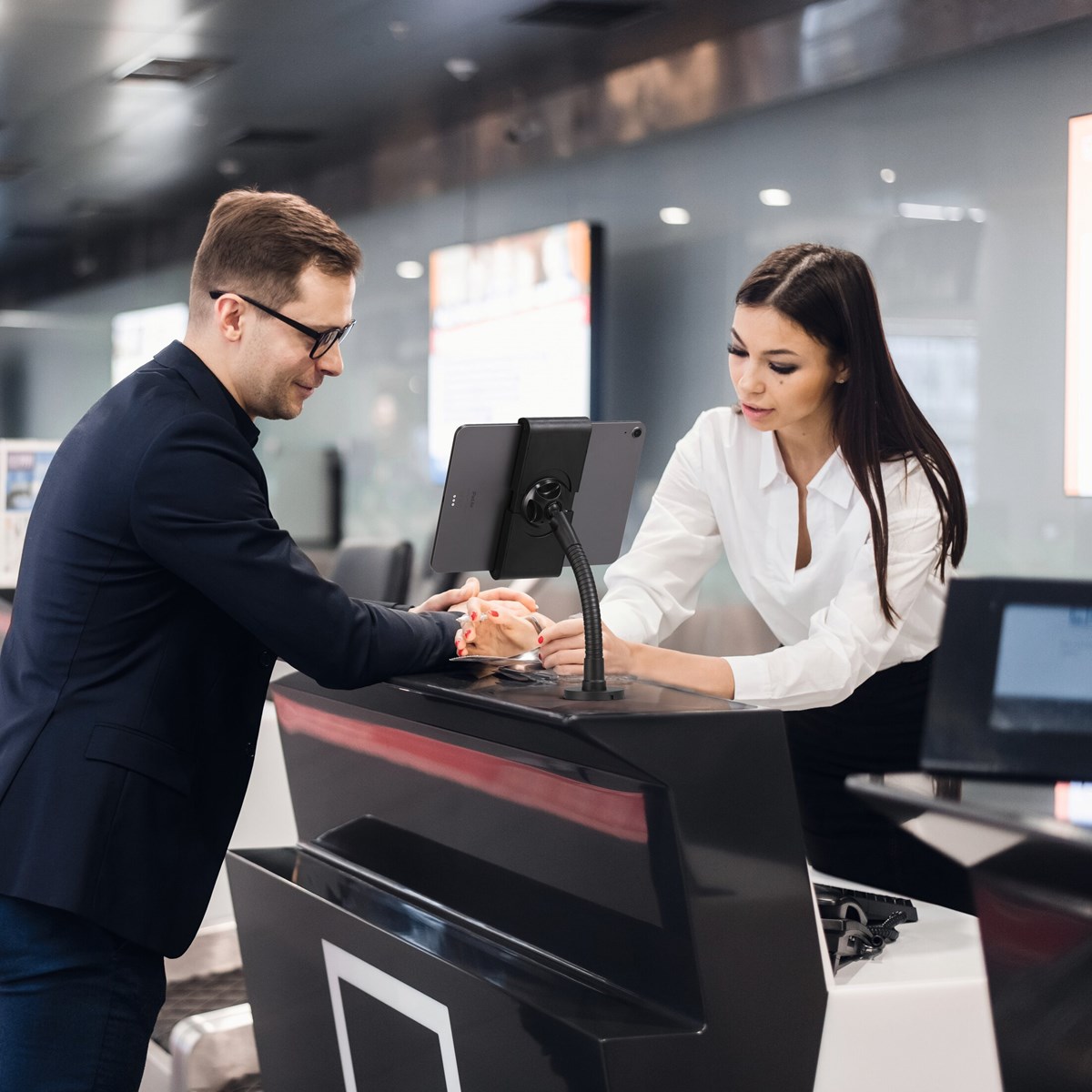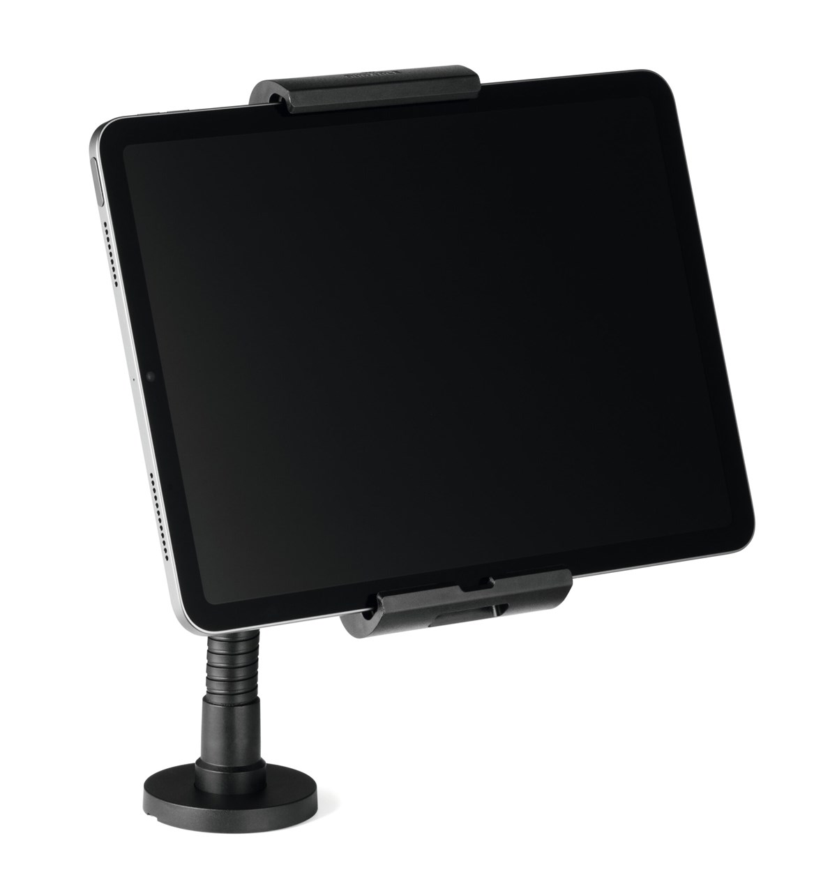 Denna smarta surfplattehållare är perfekt för butiker, receptioner och utställningslokaler. Den monteras enkelt på en bordsskiva (upp till 25 mm tjock) eller på väggen.