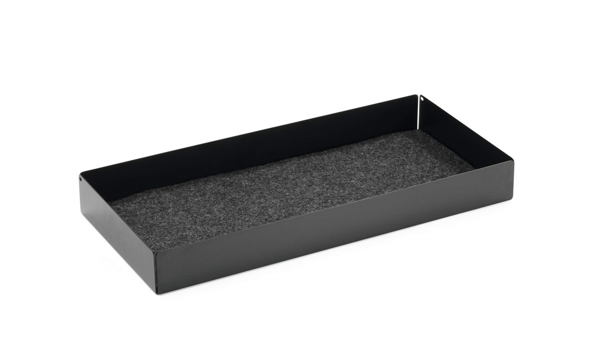 EFFECT-serien som denna låda ingår i, tillverkas av metall och har en mjuk, ljuddämpande och tålig bottenmatta av filt. Filten är tillverkad av PET-plast, varav 60% är av insamlad och återvunnen PET-plast (rPET). Material från lådans botten har använts till två glidskenor, som fästs i skärmstället. Hålen efter dessa skenor täcks av filtmattan. Produkterna i serien är 100 % återvinningsbara och förpackas hållbart med resursbesparande och plastfria material. Maxbelastning 5 kg. Mått: 46,8 x 5,3 x 22,1 cm (BxHxD).
