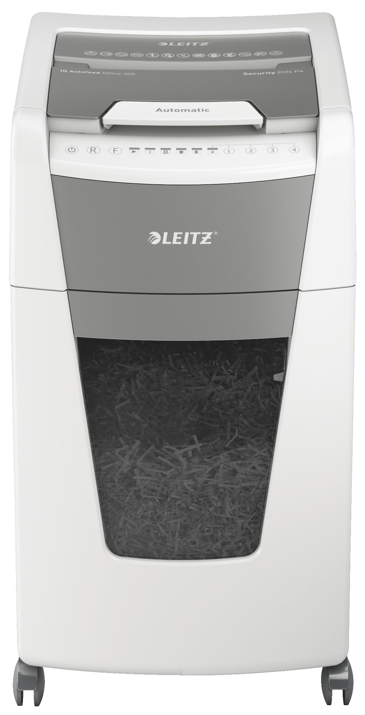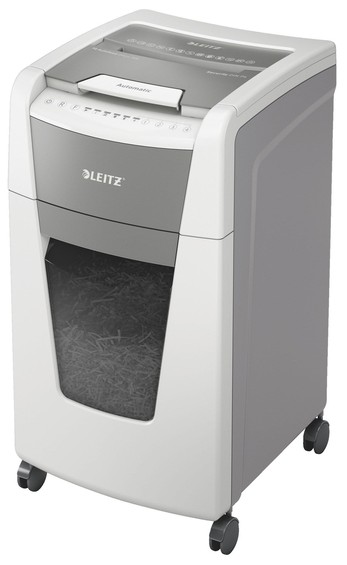 Automatisk makulering av upp till 300 A4-ark, fack för manuell arkmatning. Säkerhetsklass P4 (4x28 mm) destruerar smidigt känslig data, även personuppgifter. AntiJam. Tyst drift upp till 60 minuter, 55 dBA. Viloläge efter 3 minuters inaktivitet. Varning när 20% av behållarkapacitet kvar. Strimlar häftklammer, gem och plastkort. Mått: 415 x 735 x 465 mm. Garanti 2 + 1 år. Vi rekommenderar att man använder oljeark var tredje gång man tömmer dokumentförstörarens avfallsbehållare.