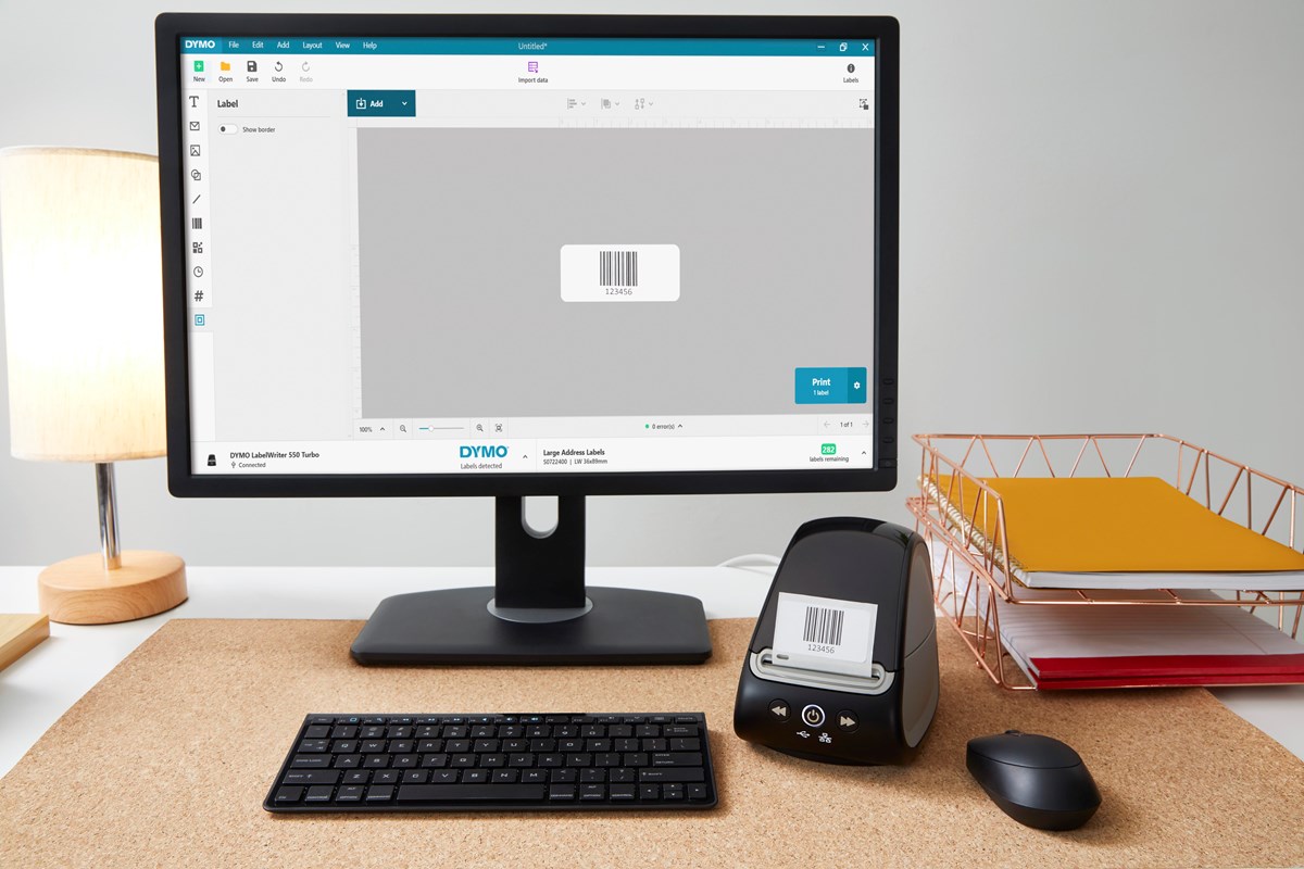 Skrivarens snygga, kompakta design och bärbara storlek gör att den enkelt passar in i alla moderna arbetsytor och den skriver ut upp till 45% snabbare än basmodellen LabelWriter 550. Skriver ut exakta etikettkvantiteter utan att du behöver brottas med arketiketter.
