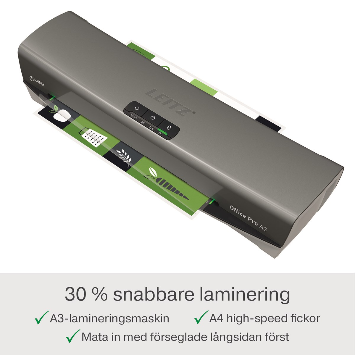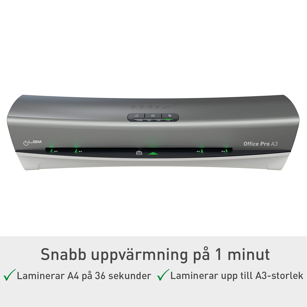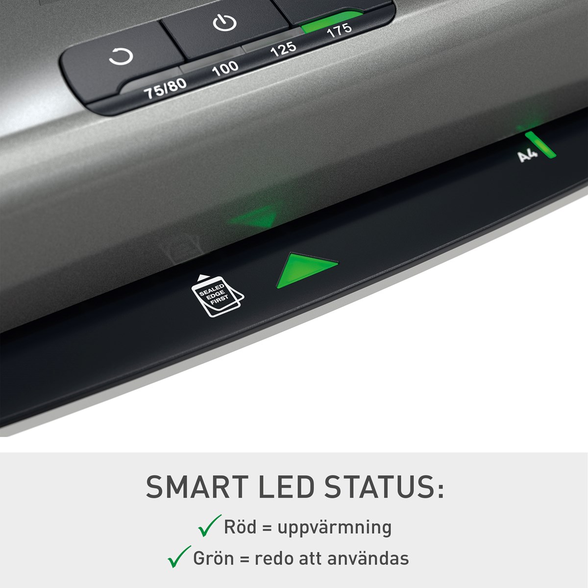 Den eleganta och sofistikerade lamineringsmaskinen Leitz iLAM Office Pro A3 kombinerar stil och hög prestanda på ett skickligt sätt. Denna A3-laminator är utformad för enkel användning och har en snabb uppvärmningstid på 1 minut och kan laminera ett A4-ark med 80 mikron på bara 23 sekunder, vilket ger ett snabbt och effektivt dokumentskydd. Den stilrena kontrollpanelen med belysta knappar ger enkel åtkomst till fyra inställningar för lamineringsfickans tjocklek. Den manuella anti-jam tillbaka-knappen med automatisk backning säkerställer problemfri drift genom att snabbt lösa eventuella stopp. Den innovativa smarta status-LED:n gör användningen enklare med intuitiva ljus och ljud: rött under uppvärmning, grönt med en ljudsignal när den är redo och blinkande rött för standby-läge efter 15 minuters inaktivitet. Dessutom säkerställer LED-lamporna SMART entry guide att lamineringsfickan är perfekt inriktad för att förhindra fastkörning.