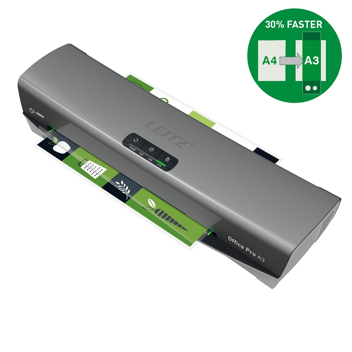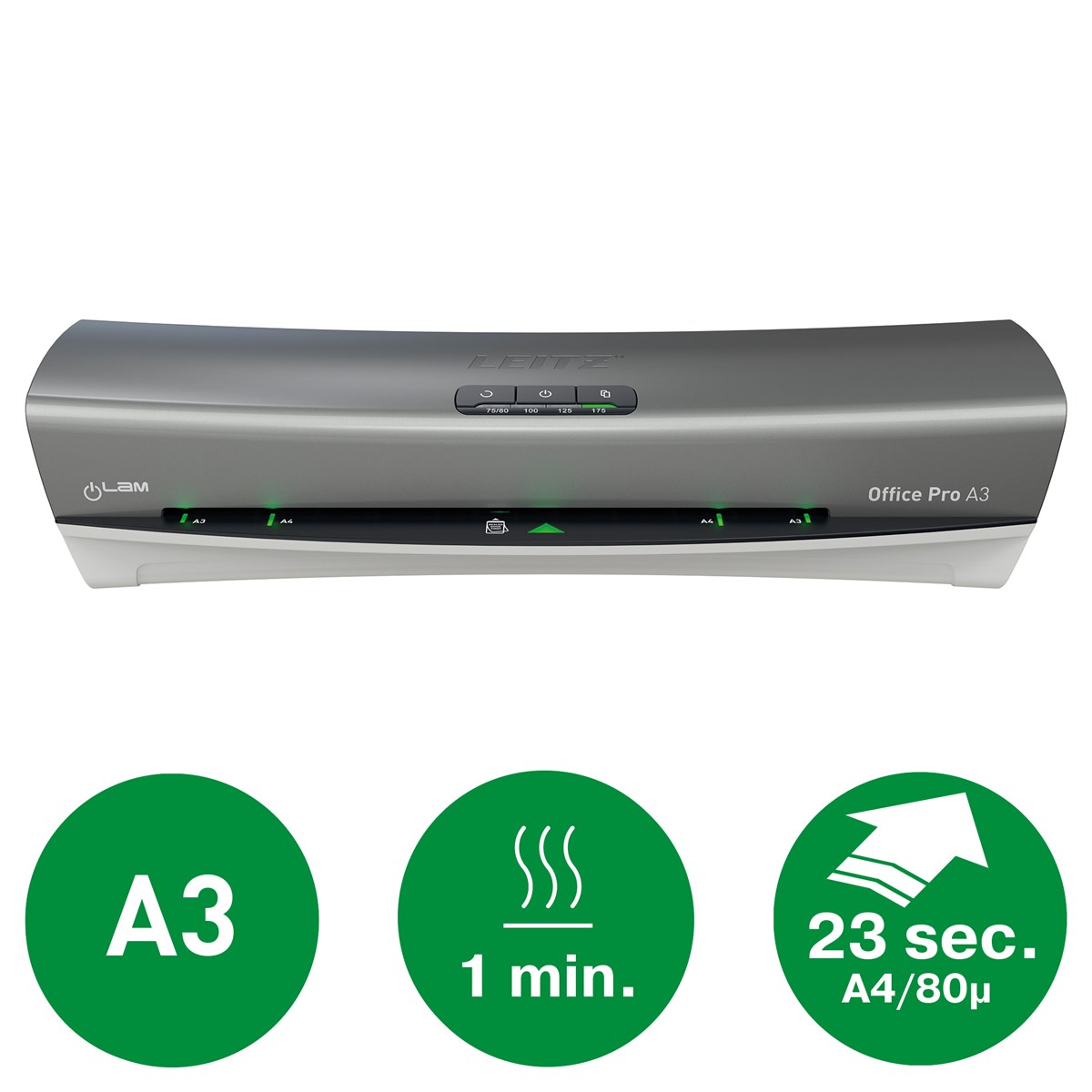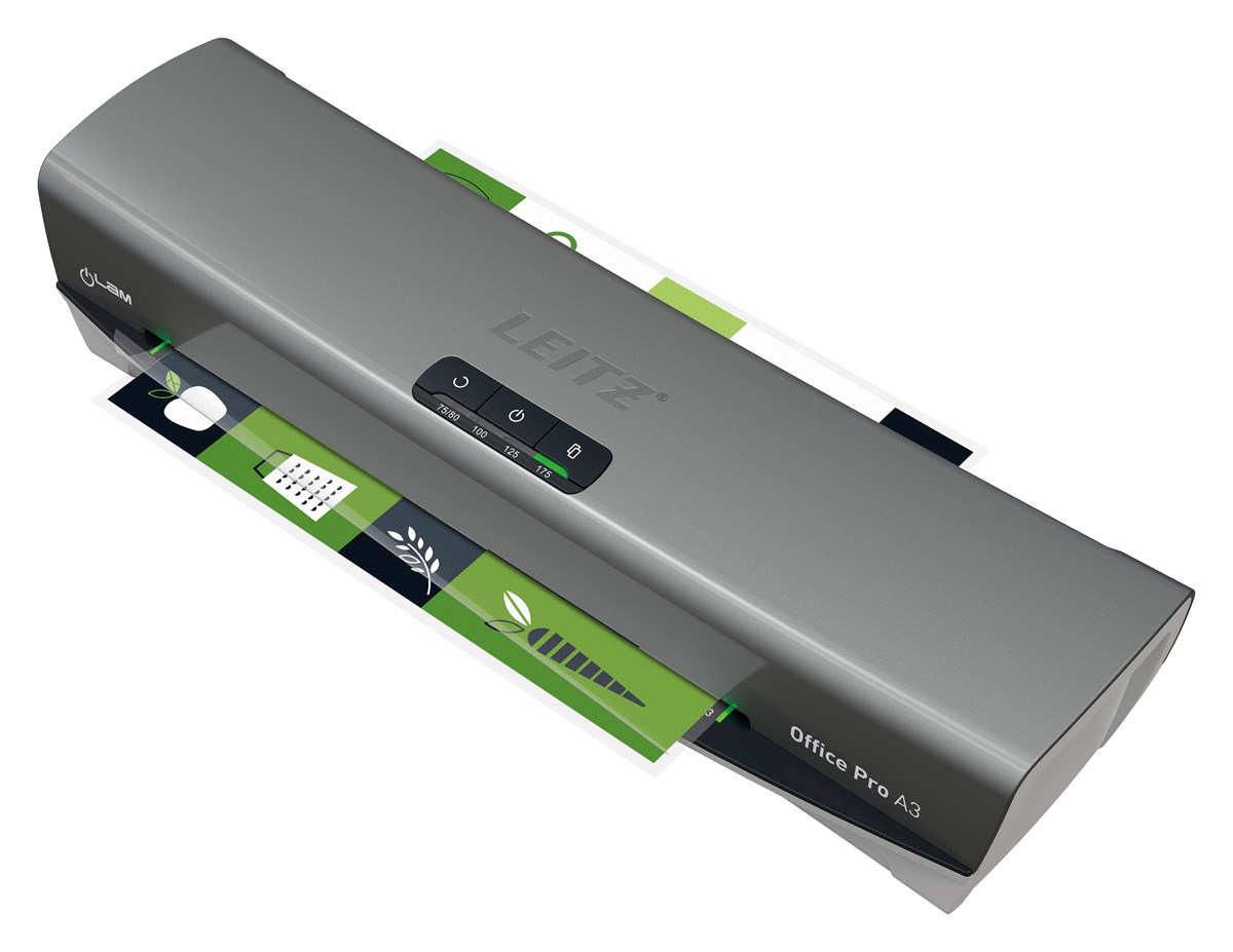 Den eleganta och sofistikerade lamineringsmaskinen Leitz iLAM Office Pro A3 kombinerar stil och hög prestanda på ett skickligt sätt. Denna A3-laminator är utformad för enkel användning och har en snabb uppvärmningstid på 1 minut och kan laminera ett A4-ark med 80 mikron på bara 23 sekunder, vilket ger ett snabbt och effektivt dokumentskydd. Den stilrena kontrollpanelen med belysta knappar ger enkel åtkomst till fyra inställningar för lamineringsfickans tjocklek. Den manuella anti-jam tillbaka-knappen med automatisk backning säkerställer problemfri drift genom att snabbt lösa eventuella stopp. Den innovativa smarta status-LED:n gör användningen enklare med intuitiva ljus och ljud: rött under uppvärmning, grönt med en ljudsignal när den är redo och blinkande rött för standby-läge efter 15 minuters inaktivitet. Dessutom säkerställer LED-lamporna SMART entry guide att lamineringsfickan är perfekt inriktad för att förhindra fastkörning.