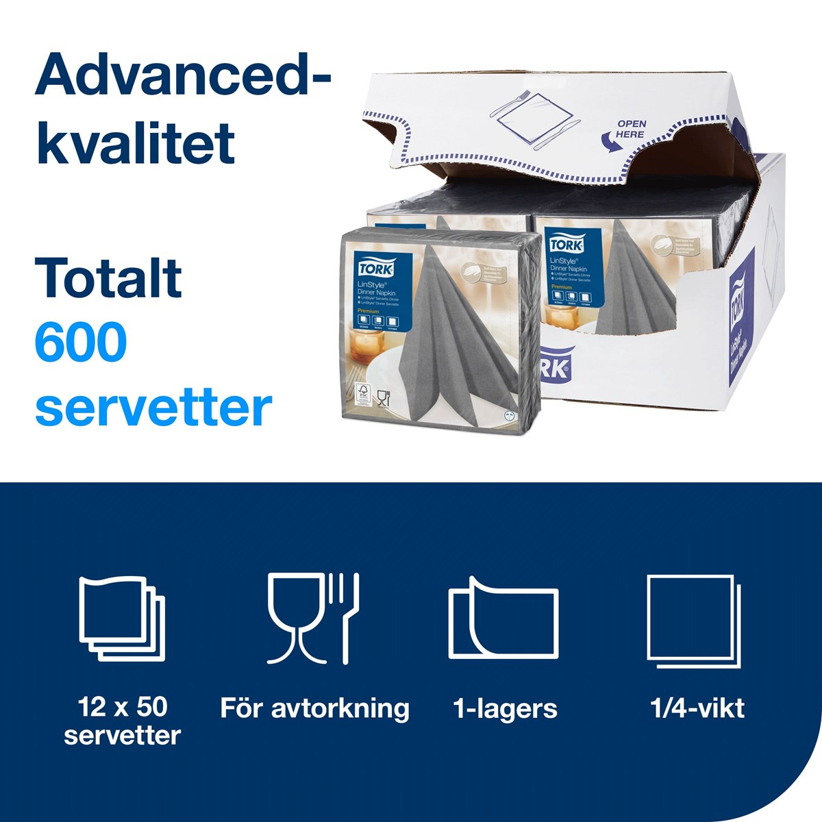 Gör ett fantastiskt första intryck i fullbetjäningsrestauranger med högkvalitativa LinStyle® Middagsservett. Med sin känsla av linne är den mjukare och tjockare än vanliga pappersservetter och ger ett elegant intryck. Suverän hållbarhet gör att restaurangservetterna varar under hela middagen, vilket minskar kostnader och förbrukning. Samtidigt ser den höga absorptionsförmågan till att personal enkelt kan städa upp spill. Med engångsservetter slipper personalen också tvättbesvären som kommer med textilservetter. 1-lagers. Premium-kvalitet. Mått vikt: 19,5x19,5 cm. Mått ovikt: 39x39 cm.