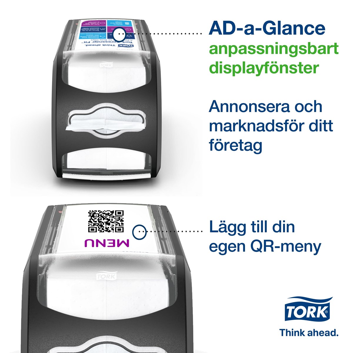Kompakt dispenser som rymmer fullstora servetter och tar liten plats på bordet Refillindikatorn visar när det är dags att fylla på dispensern Den kompakta refillförpackningen minskar behovet av lagerutrymme Reklamfönster