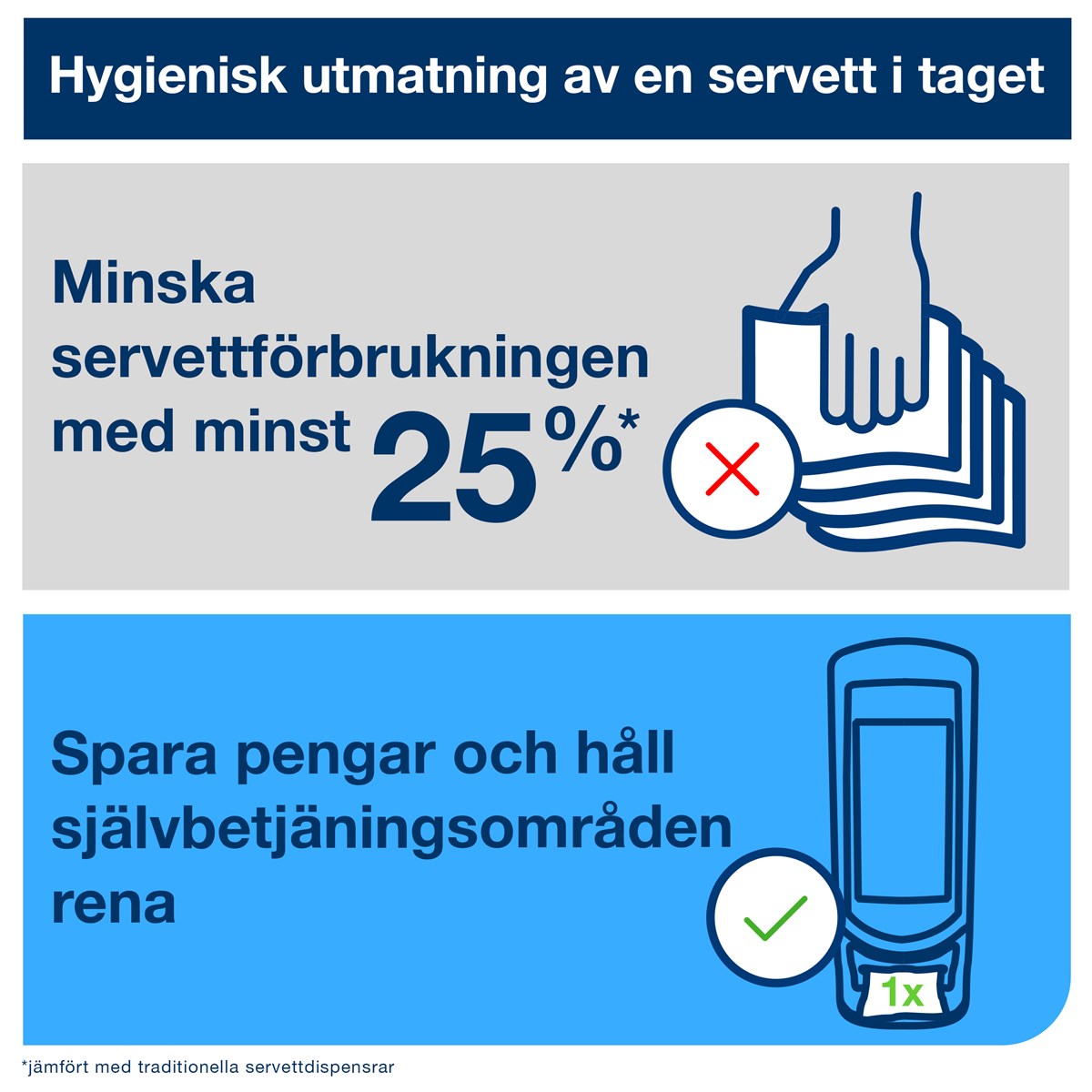 Stående design som spar plats på disken Enkel väggmontering Fönster för reklam eller personalinstruktioner Ett ark i taget för förbättrad hygien och minskad förbrukning Slitstark och enkel att rengöra
