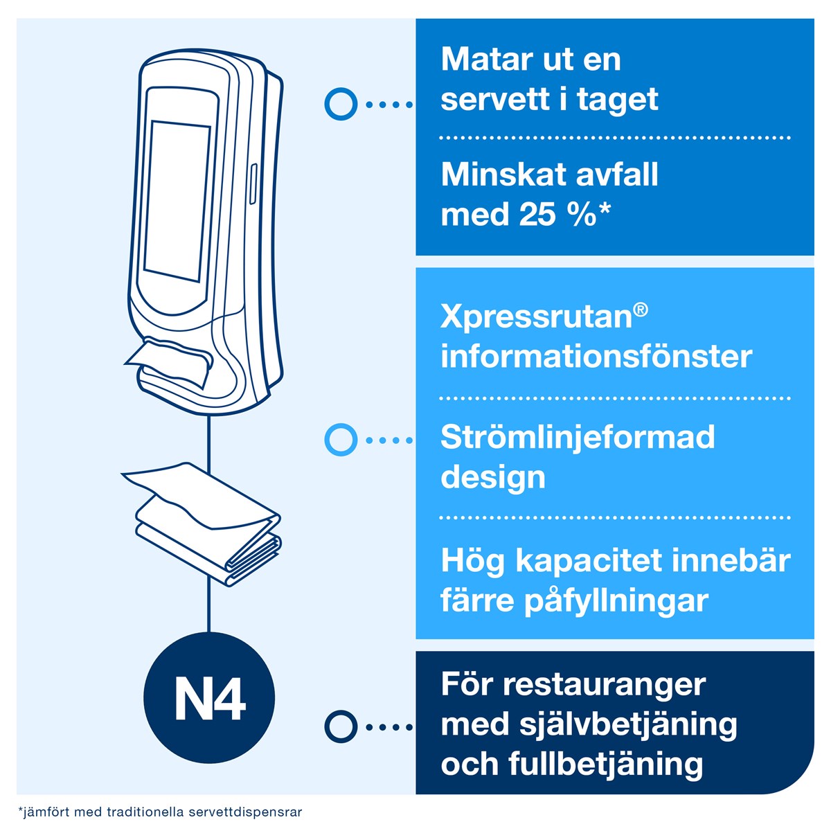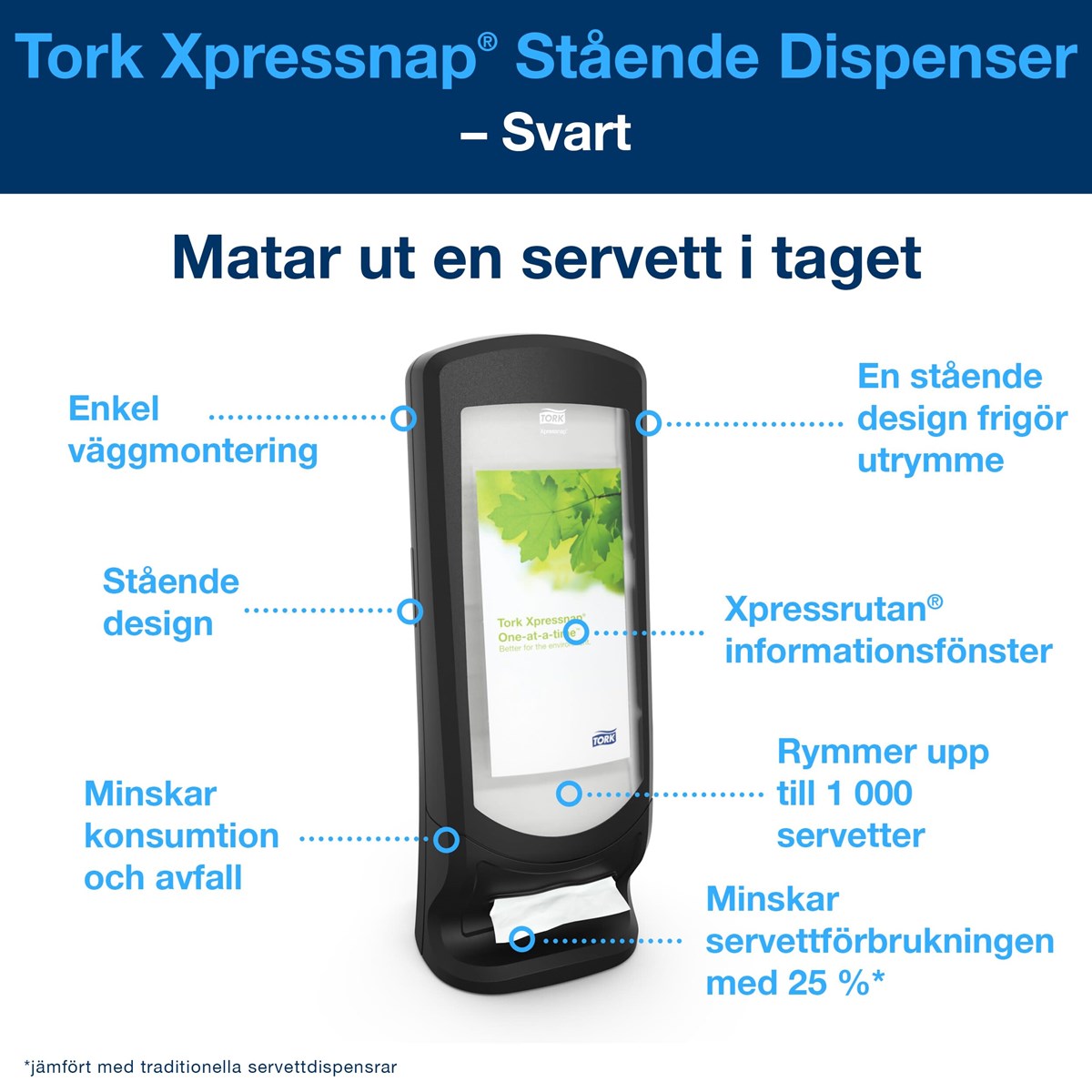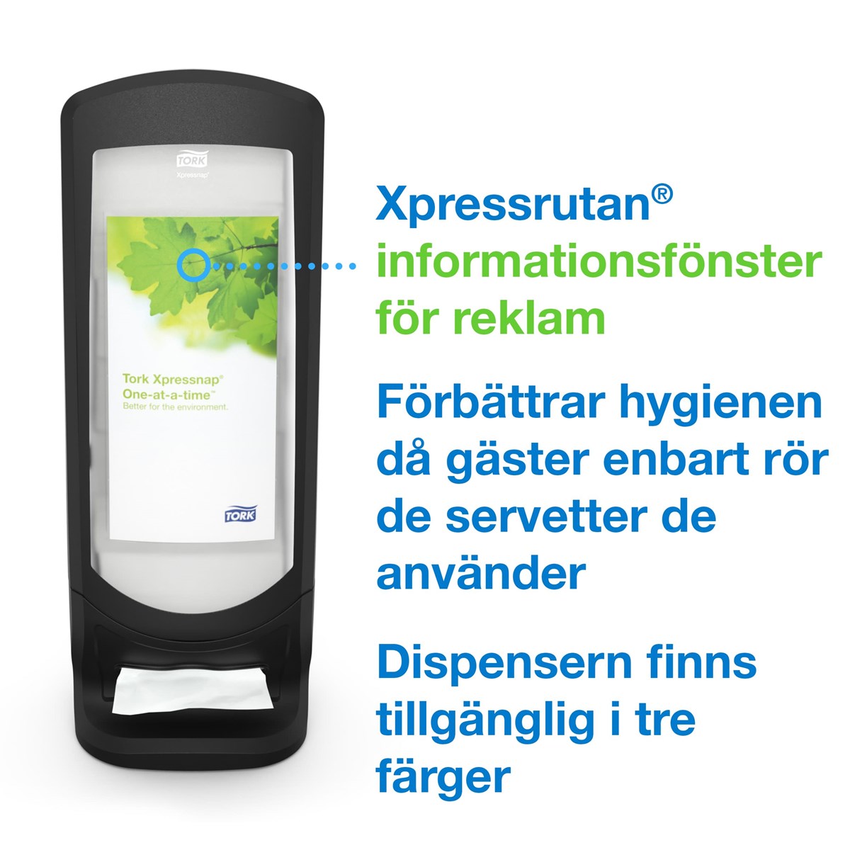 Stående design som spar plats på disken Enkel väggmontering Fönster för reklam eller personalinstruktioner Ett ark i taget för förbättrad hygien och minskad förbrukning Slitstark och enkel att rengöra