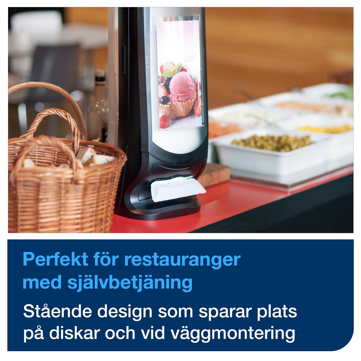 Stående servettdispenser som också kan hängas på väggen. Placera eget budskap i reklamrutan. Hög kapacitet – rymmer 1100 N4-servetter. Format: H62,2 x B23,5 x D23,5 cm.