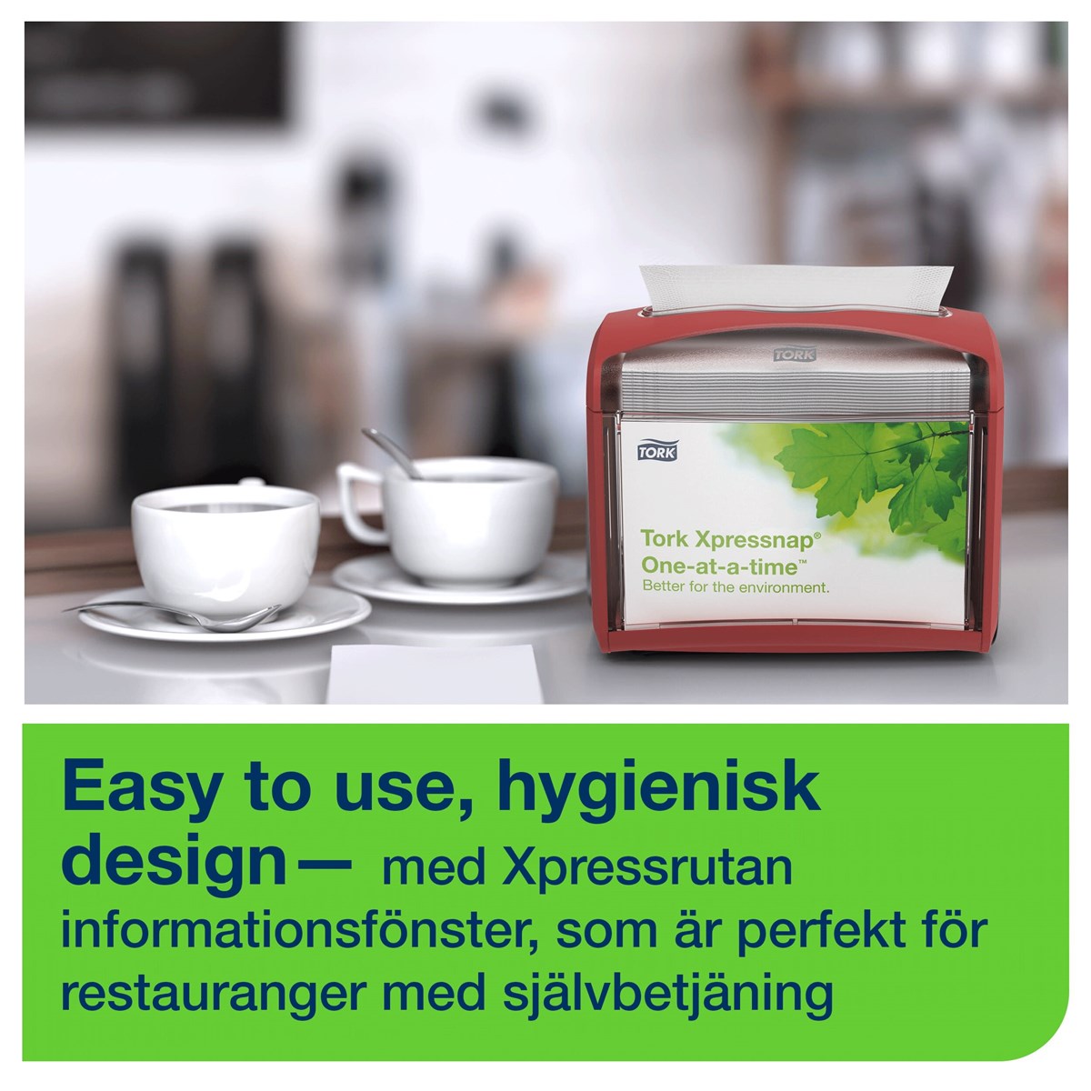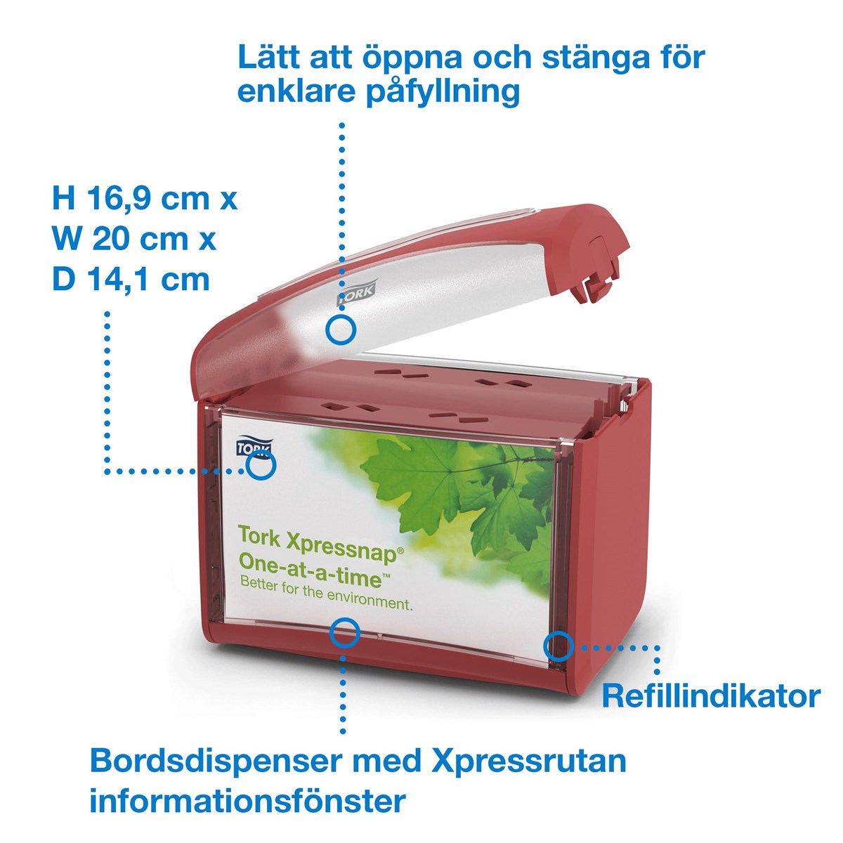 Smidig, toppmatad servettdispenser. Utmärkt för bord och diskar. Placera eget budskap i reklamrutan. Rymmer 275 st N4-servetter. Format: H15,5 x B20,1 x D14,6 cm.