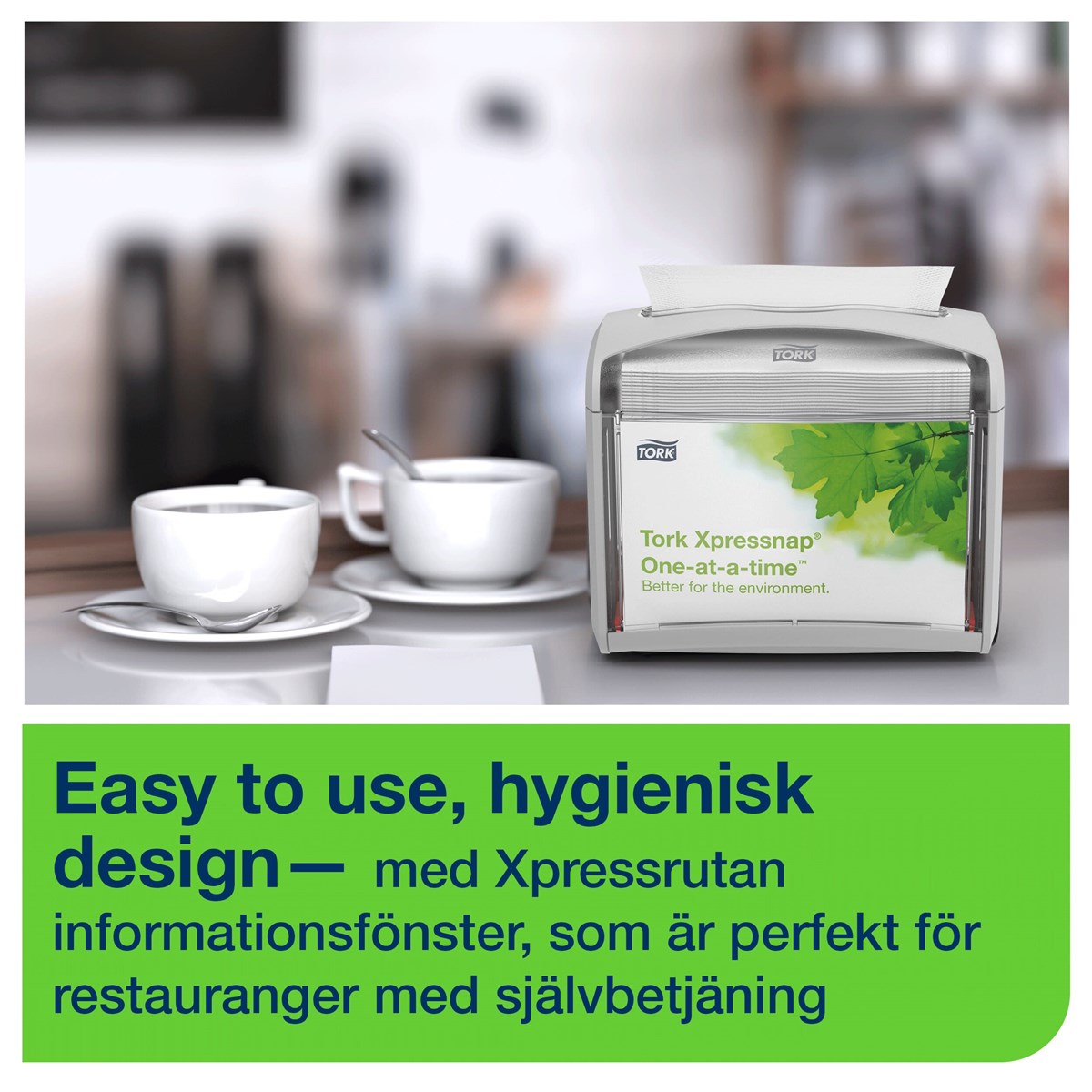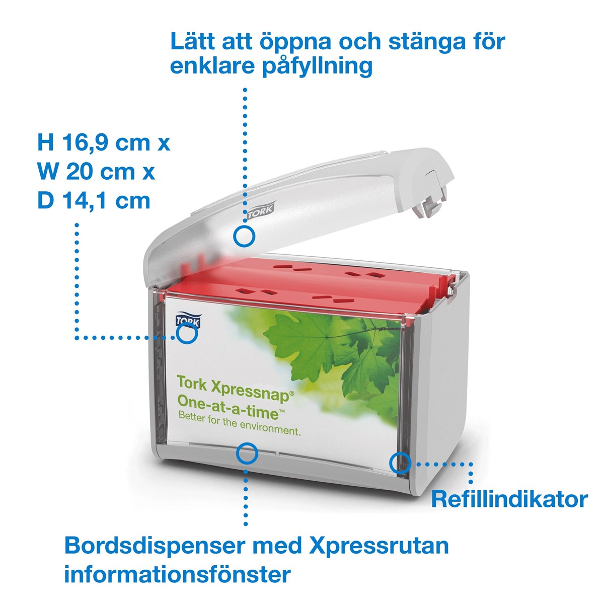 Smidig, toppmatad servettdispenser. Utmärkt för bord och diskar. Placera eget budskap i reklamrutan. Rymmer 275 st N4-servetter. Format: H15,5 x B20,1 x D14,6 cm.