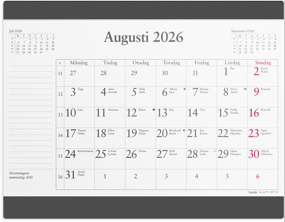 Format: 240x152 mm. Layout: Månad/blad. Kalendarium: 2026-01-01 - 2026-12-31. Omslag: Plast. Häftklamrad. Innehåll: Flaggdagar, Helgdagar, Månfaser, Namnsdagar. Antal sidor: 12. Miljöinformation: FSC®.