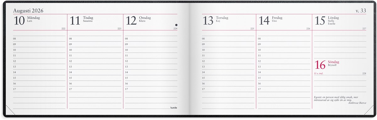 Format: 148x90 mm. Layout: Stående. Vecka/uppslag. Timindelning 8-17. Kalendarium: 2025-12-15 - 2027-01-03. Omslag: Skinn. Inbunden. Innehåll: Kyrkliga helgdagar, Flaggdagar, Helgdagar/aftnar, Månfaser, Namnsdagar, Internationella helgdagar översikt, Löst telefonregister, Temadagar/händelser, Årsöversikt/årsöversikter, Årsplan/årsplaner. Antal sidor: 128. Miljöinformation: FSC®.