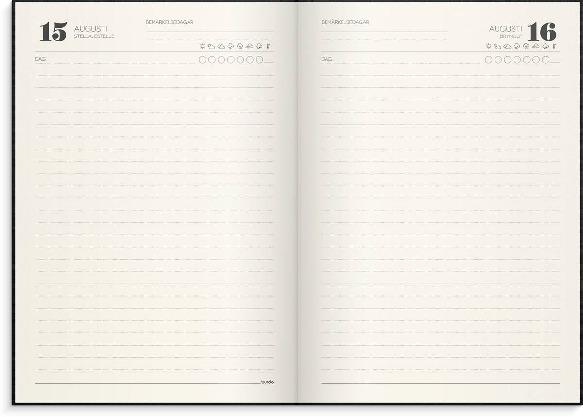 Format: 142x205 mm. Layout: Dag/sida. Omslag: Linnetextil. Inbunden. Detaljer: Märkband. Innehåll: Årsplan, namnsdagsregister. Antal sidor: 384. Pappersvikt: 100 g. Miljöinformation: FSC. Varumärke: Burde.