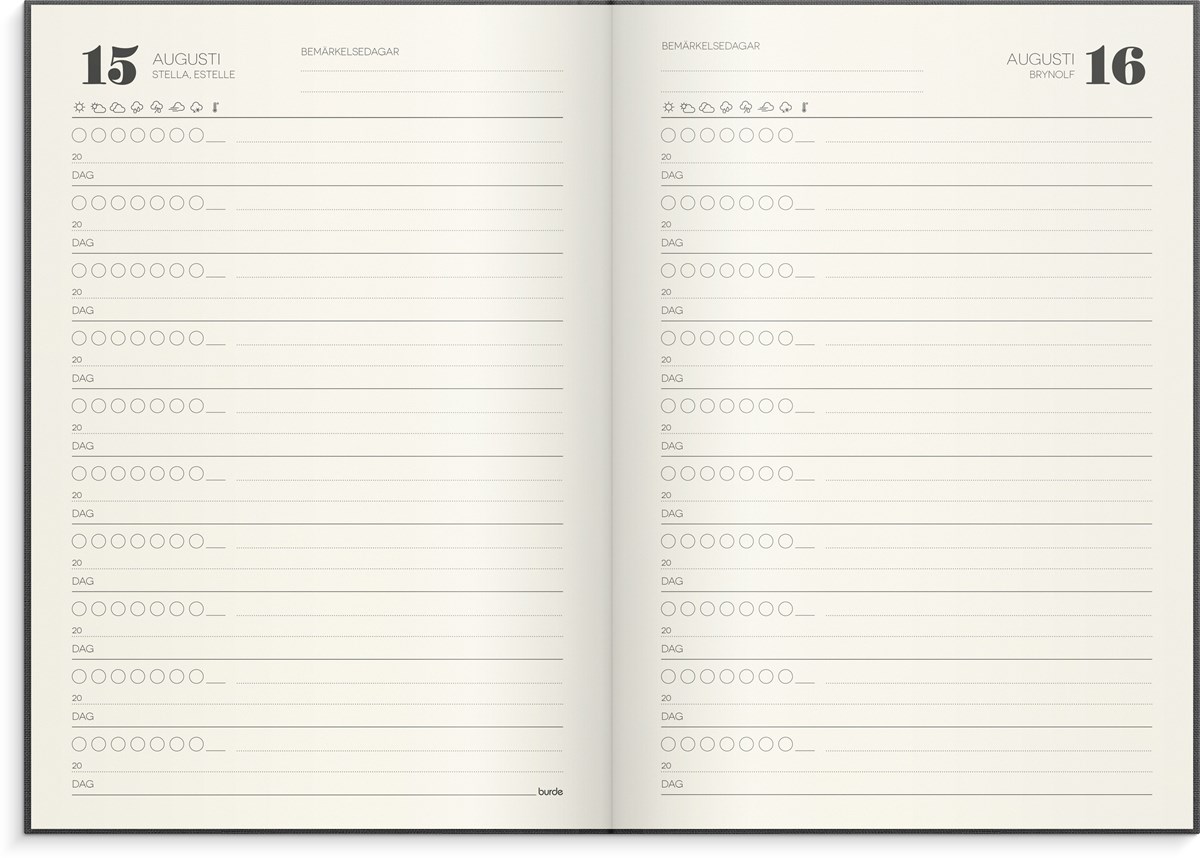 Format: 142x205 mm. Layout: Dag/sida. Omslag: Linnetextil. Inbunden. Detaljer: Märkband. Innehåll: Årsplan, namnsdagsregister. Antal sidor: 384. Pappersvikt: 100 g. Miljöinformation: FSC-papper. Varumärke: Burde.