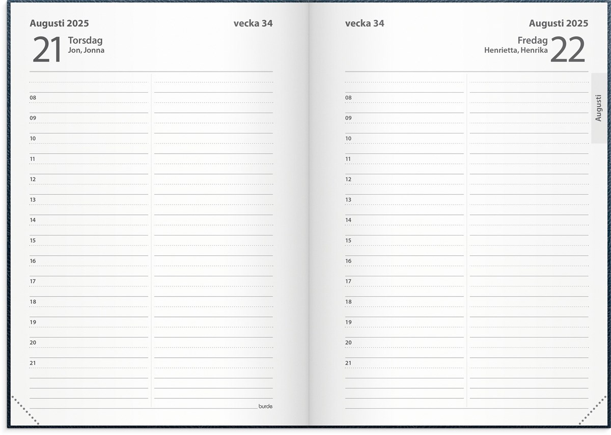 Kalender 2025 från Burde. Format: A6. Layout: Dag/sida. Timindelning 8-21. Kalendarium: 2025-01-01 - 2025-12-31. Omslag: Konstläder. Inbunden. Innehåll: Årsöversikt, årsplaner. Antal sidor: 400. Miljöinformation: FSC®.