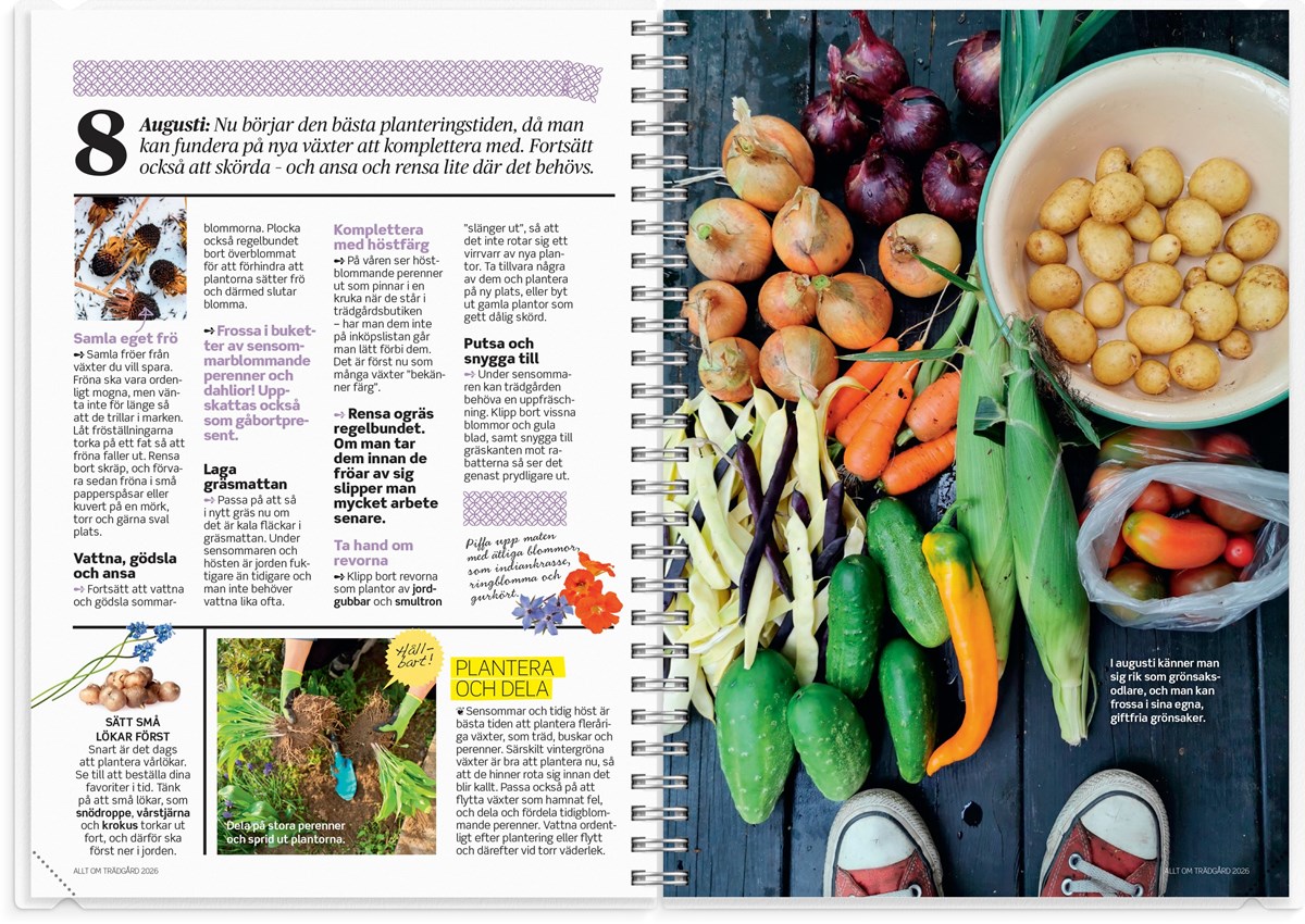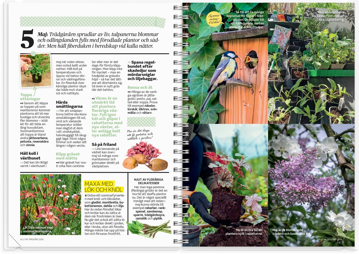 Tillsammans med tidningen Allt om Trädgård har Burde tagit fram en trädgårdskalender som hjälper dig att planera hela odlingsåret. Varje månad inleds med ett inspirerande uppslag där du får tips och påminnelser om vad som behöver göras i trädgården baserat på tiden på året, därefter följer vanlig klassisk veckoplanering. Det tåliga omslaget i plast gör att du kan ha med kalendern ut i odlingarna utan att innehållet skadas av jord och vatten. Planera smart och nå dina odlingsdrömmar!