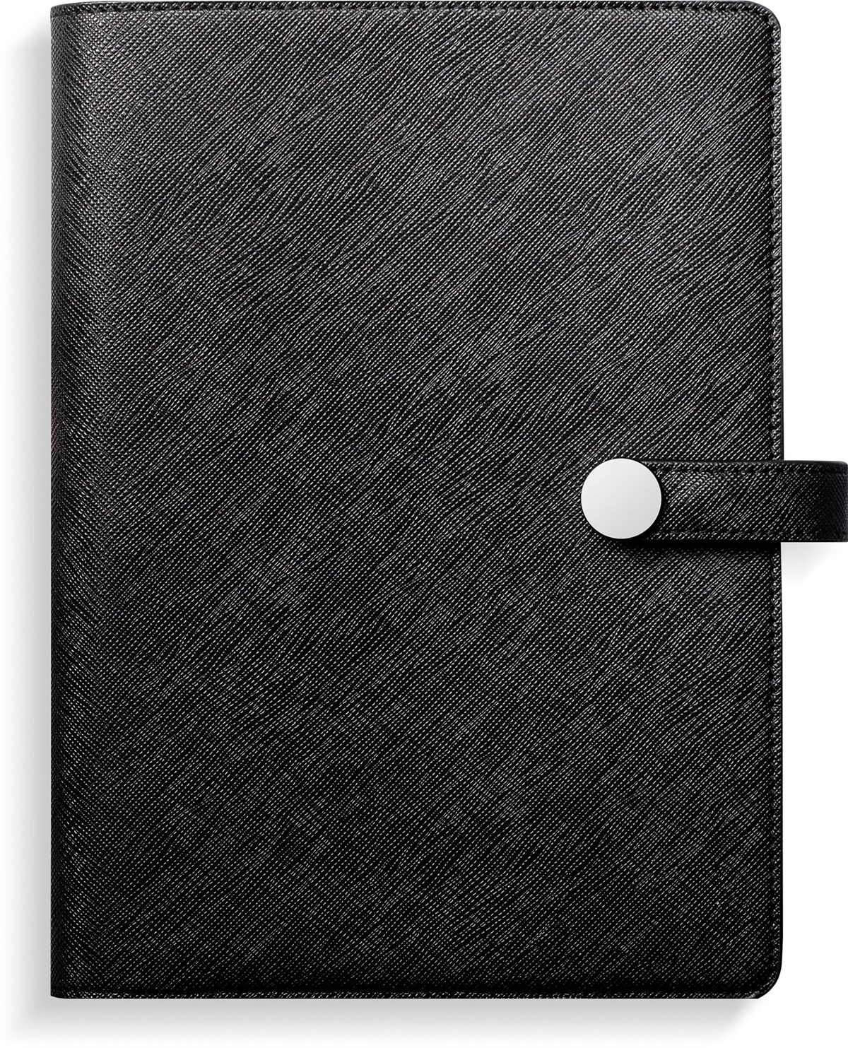 Kalender med löst omslag med slejf, två fickor för visitkort eller bankkort samt en större ficka på insidan. Pennhållare. Diplomat monterad inuti omslaget.