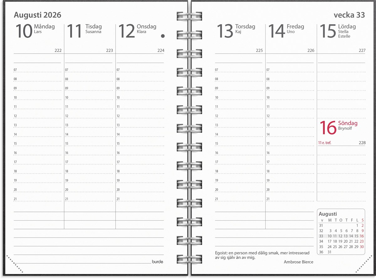 Format: 83x127 mm. Layout: Stående. Vecka/uppslag. Timindelning 7-21. Kalendarium: 2025-12-08 - 2027-01-03. Omslag: Återvunnen kartong. Spiralbunden. Innehåll: Kyrkliga helgdagar, Flaggdagar, Helgdagar/aftnar, Månfaser, Namnsdagar, Internationella helgdagar översikt, Telefonregister, Temadagar/händelser, Årsöversikt/årsöversikter, Årsplan/årsplaner. Antal sidor: 144. Miljöinformation: FSC®. Omslag i återvunnen kartong. Tillverkad i Småland.