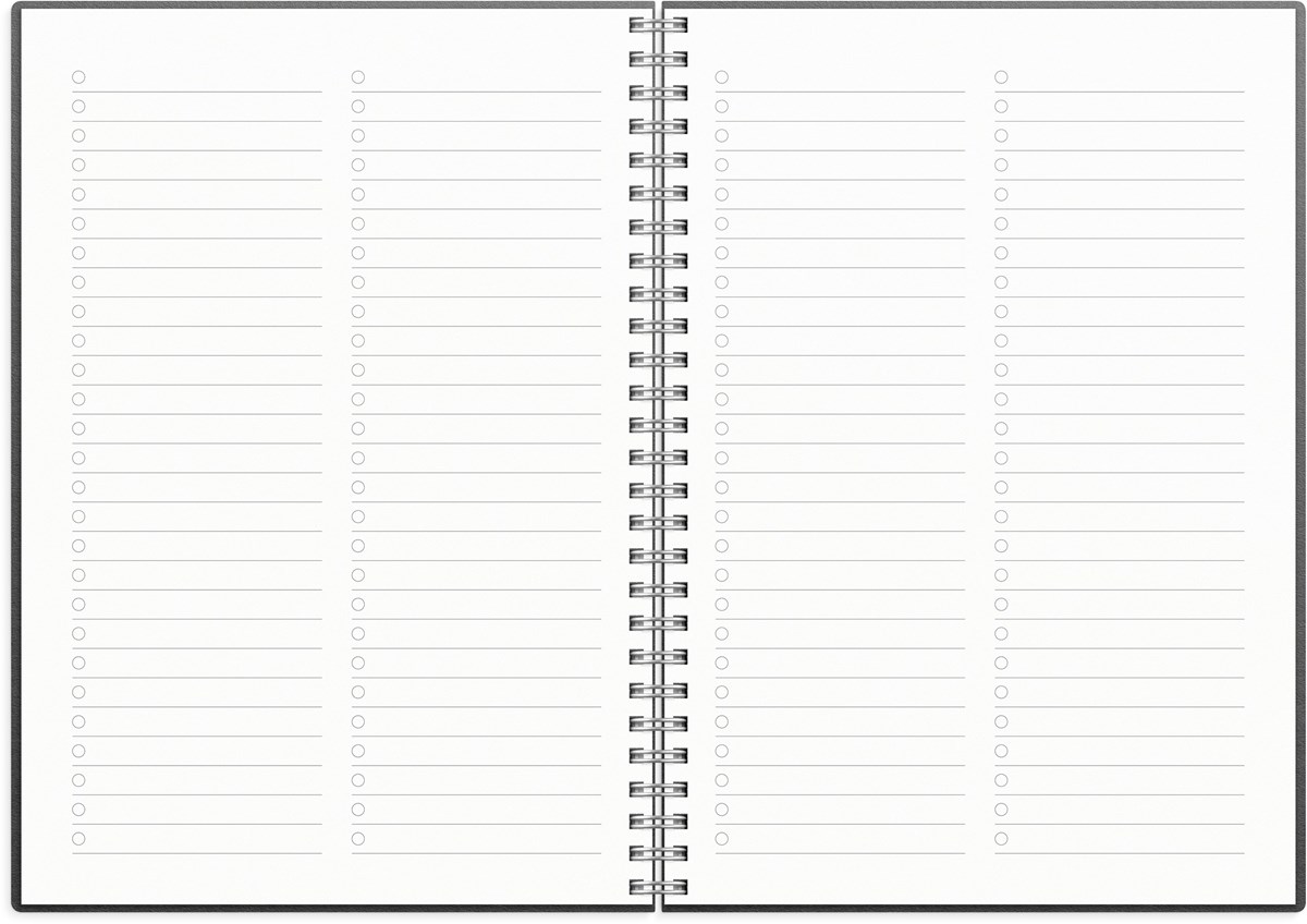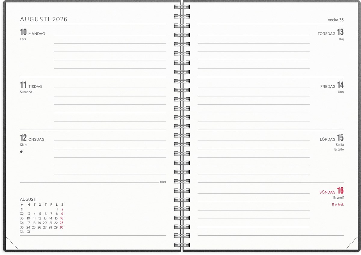 Format: A5. Layout: Liggande. Vecka/uppslag. Kalendarium: 2025-12-08 - 2027-01-03. Omslag: Konstläder. Spiralbunden. Innehåll: Kyrkliga helgdagar, Flaggdagar, Helgdagar/aftnar, Månfaser, Namnsdagar, Temadagar/händelser, Årsöversikt/årsöversikter, Årsplan/årsplaner. Antal sidor: 144. Miljöinformation: FSC® papper.