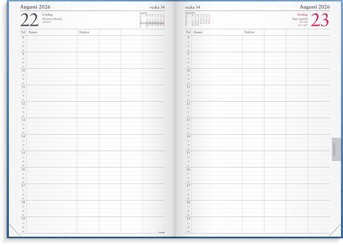 Kalender 2026 från Burde. Format: 180x265 mm. Layout: Dag/sida. Quarteerly division 8-20. Kalendarium: 2026-01-01 - 2026-12-31. Omslag: Kartong. Inbunden. Detaljer: Märkband. Innehåll: Fem kolumner varav tre fria, årsöversikter, årsplan. Antal sidor: 368. Miljöinformation: FSC®.
