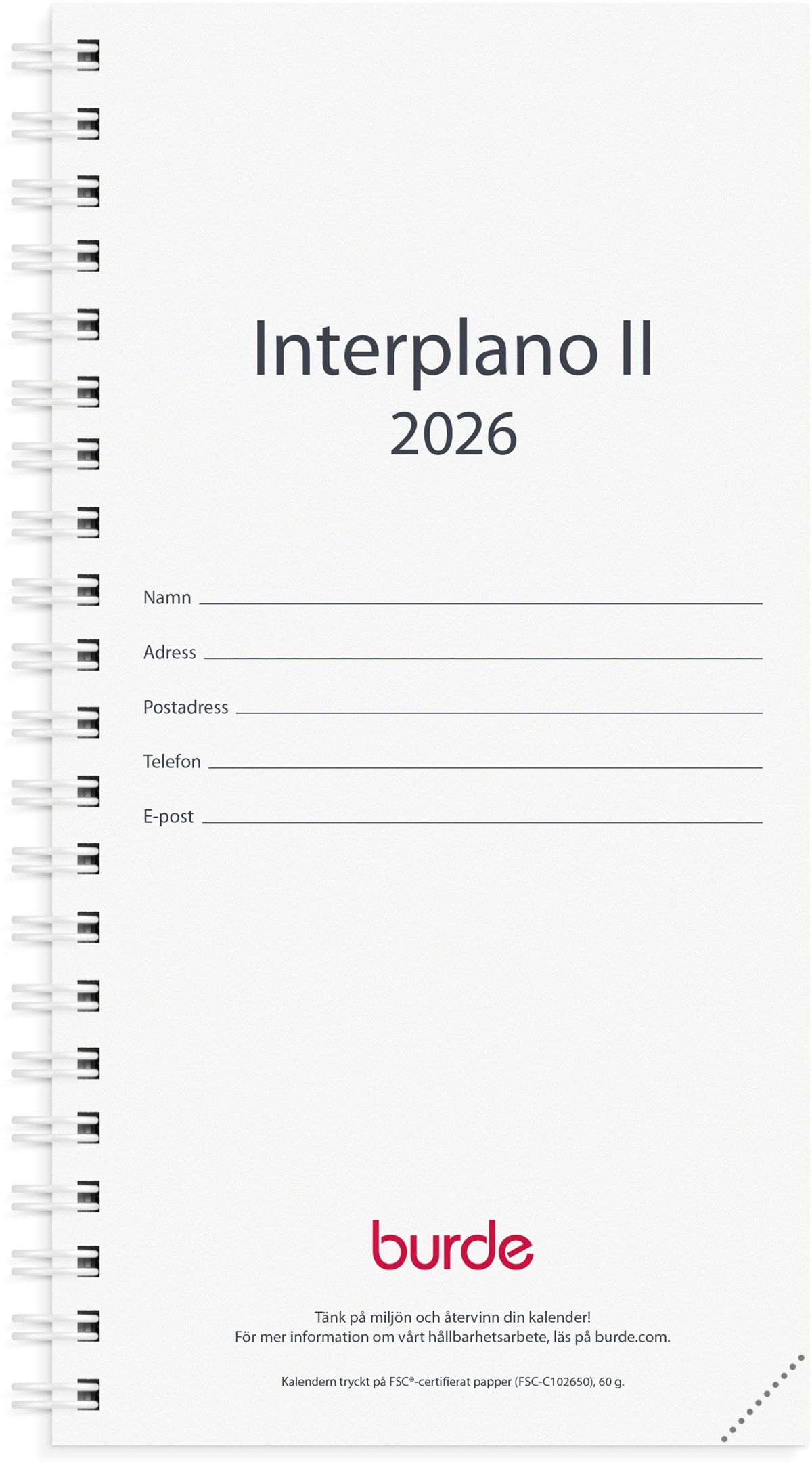 Format: 83x158 mm. Layout: Stående. Vecka/uppslag. Timindelning 8-19. Kalendarium: 2025-09-15 - 2027-03-14. Omslag: Kartong. Spiralbunden. Innehåll: Kyrkliga helgdagar, Flaggdagar, Helgdagar/aftnar, Månfaser, Namnsdagar, Internationella helgdagar översikt, Temadagar/händelser, Årsöversikt/årsöversikter, Årsplan/årsplaner. Antal sidor: 160. Miljöinformation: FSC®.