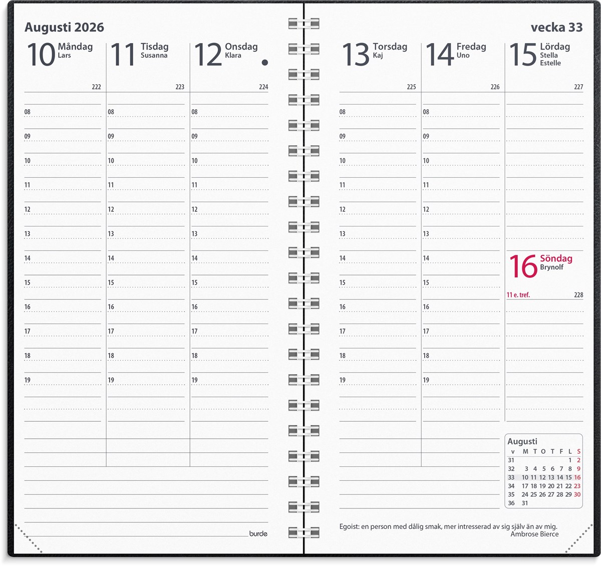 Format: 83x158 mm. Layout: Stående. Vecka/uppslag. Timindelning 8-19. Kalendarium: 2025-09-15 - 2027-03-14. Omslag: Konstläder. Spiralbunden. Innehåll: Atlas, Kyrkliga helgdagar, Flaggdagar, Helgdagar/aftnar, Månfaser, Namnsdagar, Internationella helgdagar översikt, Telefonregister, Temadagar/händelser, Årsöversikt/årsöversikter, Årsplan/årsplaner. Antal sidor: 160. Miljöinformation: FSC®.