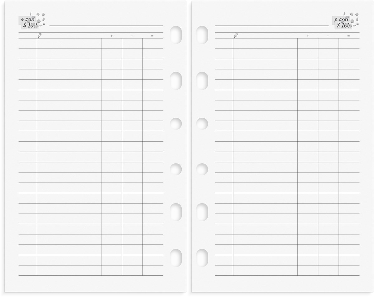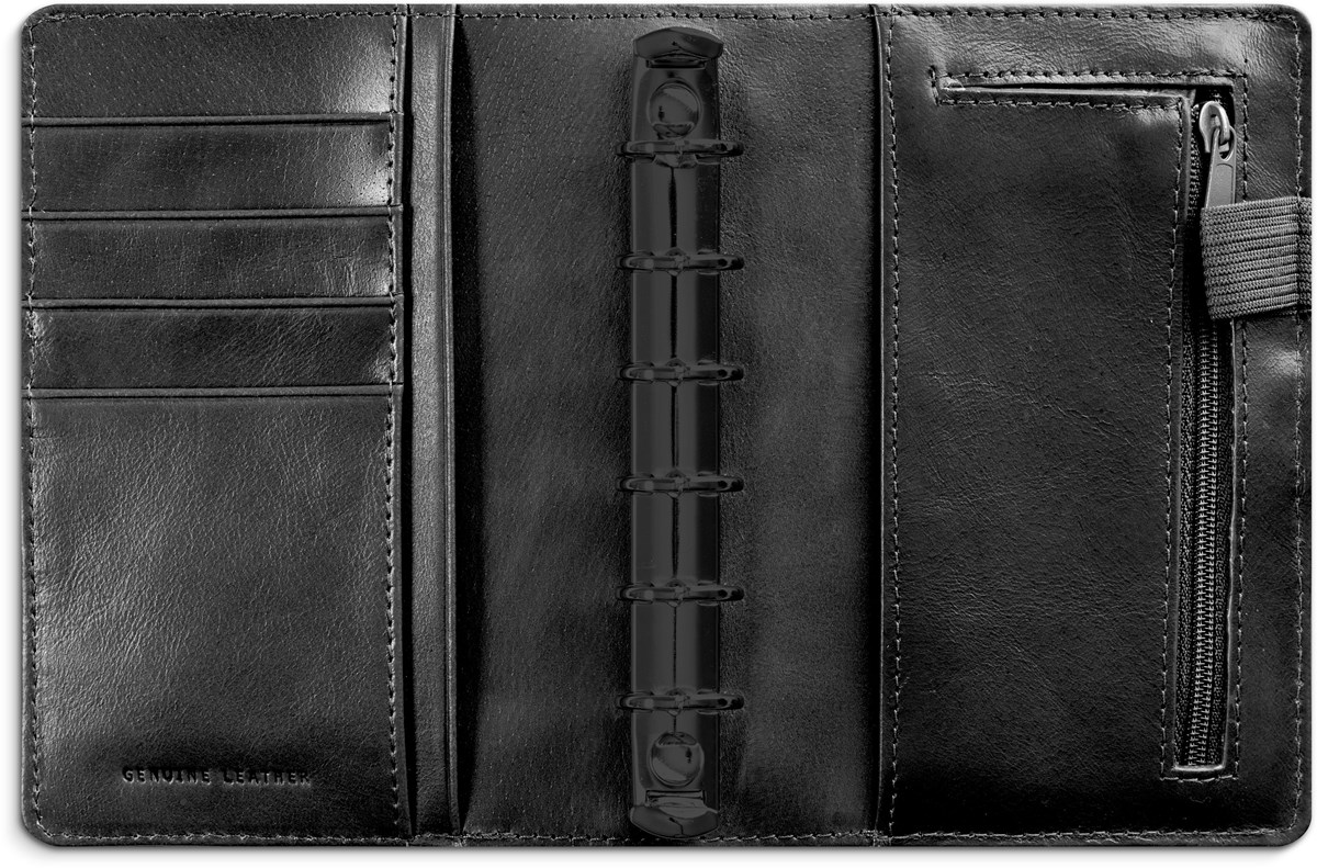 Systemkalender med grundsats. Grundsatsen innehåller hålad kalenderdel (4201) och blankettdel. Pärmen har ringmekanism (Ø 20 mm), fyra kreditkortsfickor, sedelfack, myntficka, fack för kvitton o dyl och pennhållare. Format pärm: 110x150 mm.