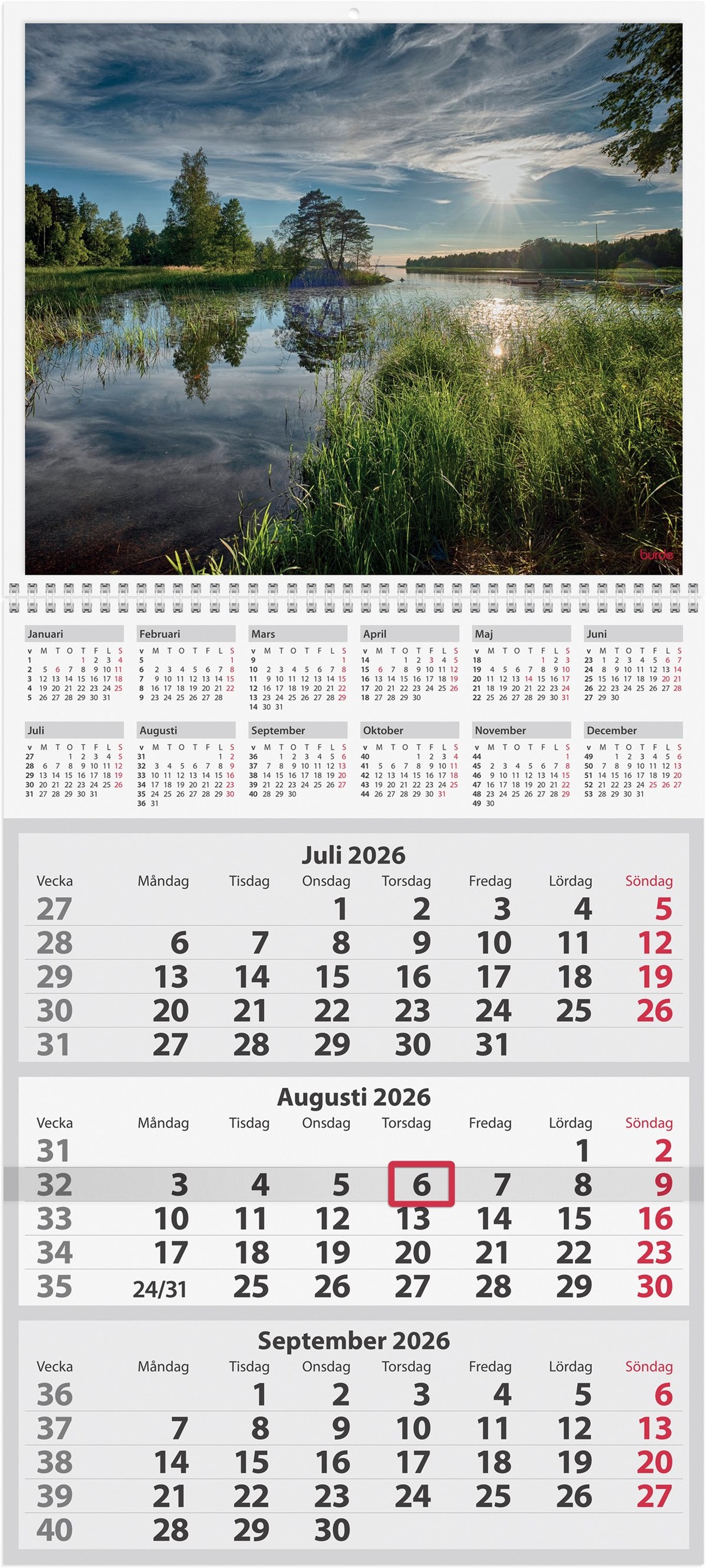 Format: 330x455 mm. Layout: Månad/blad. Kalendarium: 2026-01-01 - 2026-12-31. Spiralbunden. Innehåll: Årsöversikt/årsöversikter. Antal sidor: 12. Miljöinformation: FSC®.
