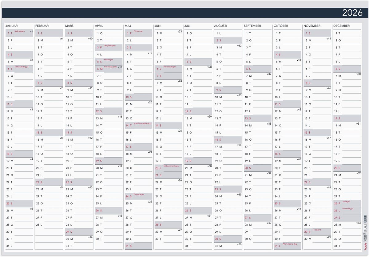 Väggkalender 2026 från Burde. Format: 980x680 mm. Layout: År/blad. Kalendarium: 2025-01-01 - 2025-12-31. Innehåll: Helgdagar, anteckningssidor, årsplan/årsplaner. Antal sidor: 2. Miljöinformation: FSC®.