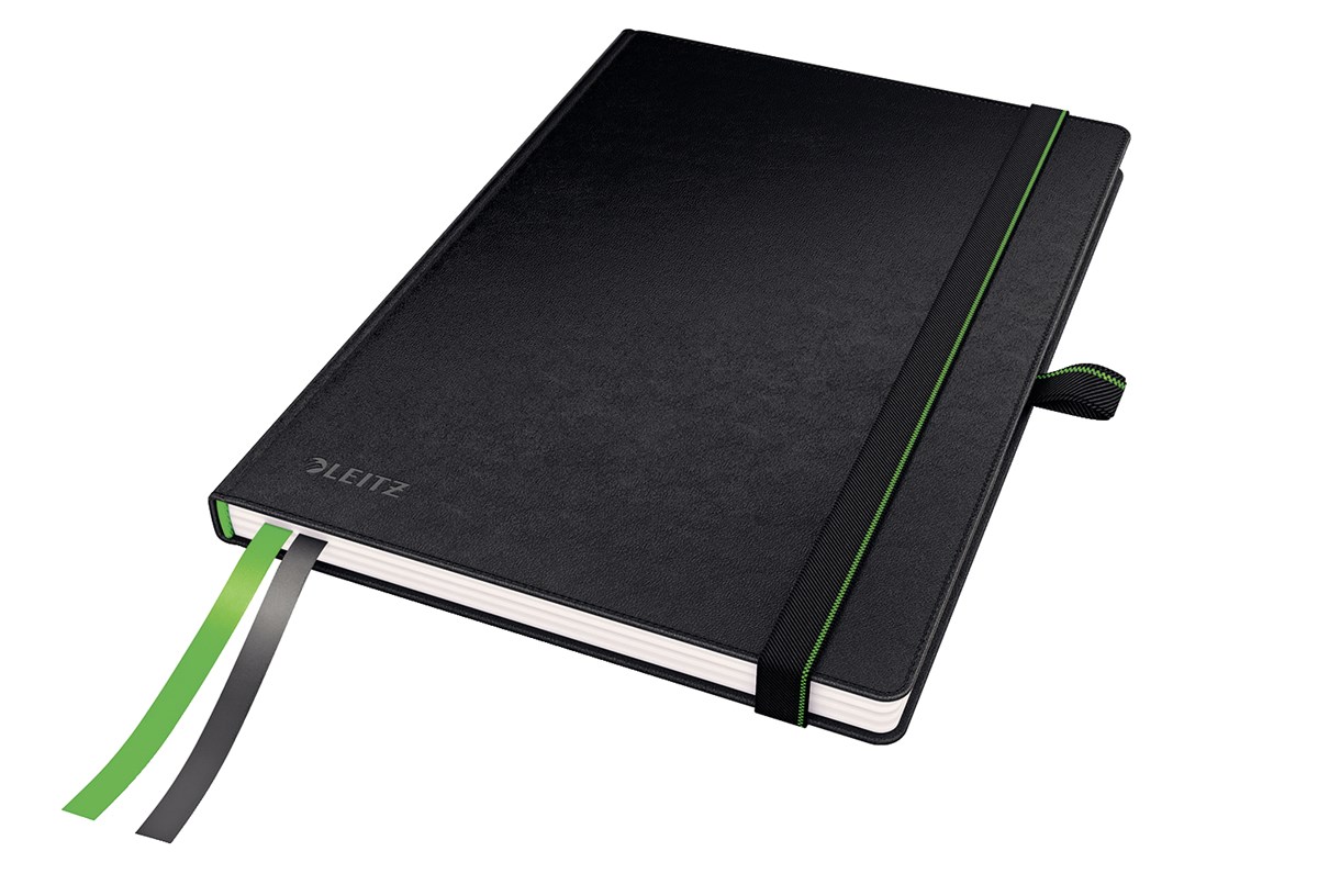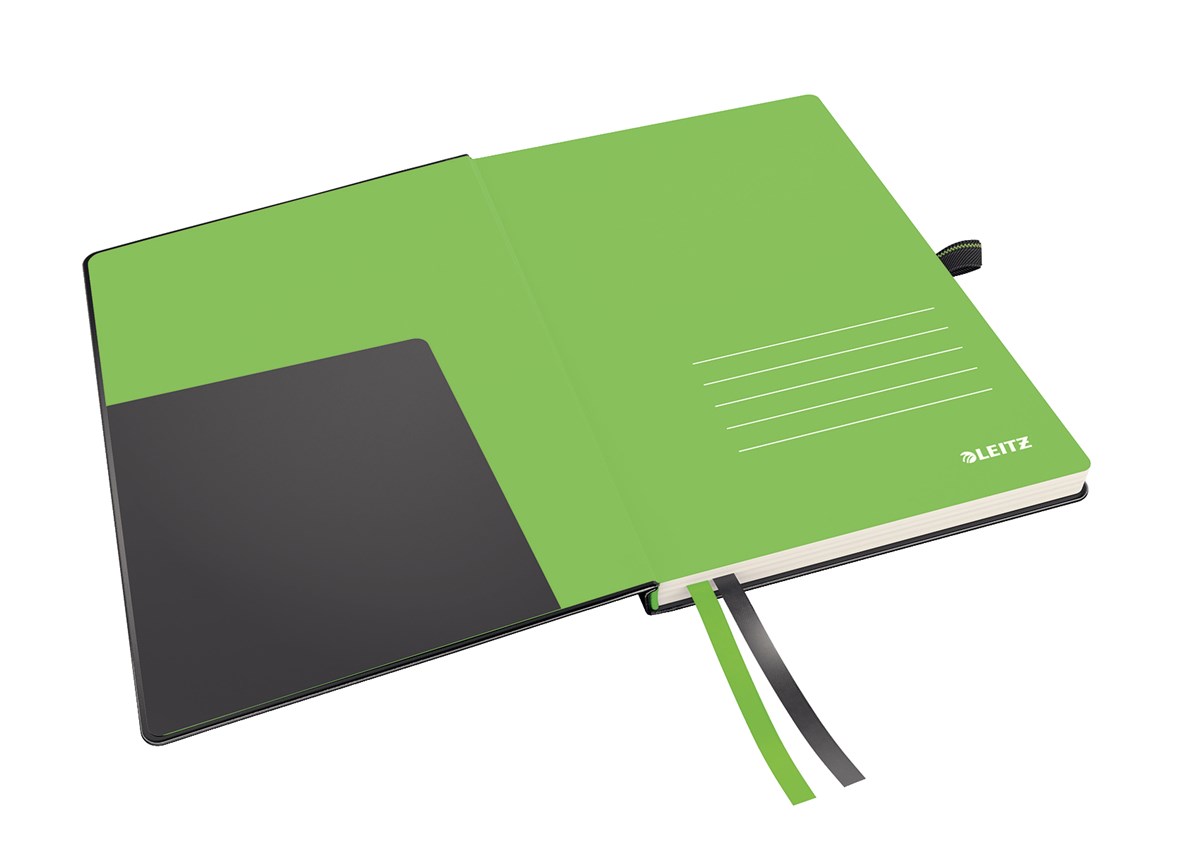 Inbunden anteckningsbok med innovativa funktioner. Attraktivt läderutseende med skön känsla. 80 g elfenbensfärgat papper av hög kvalitet. Två tygband som hjälper dig att hitta och öppna viktiga sidor snabbt. De sista åtta sidorna är perforerade med tre perforeringar per sida för enkel delning i mindre noteringar. Två buntar med 10 st självhäftande märkflikar medföljer för markering av viktig information. Gummibandsförslutning och pennhållare. Ficka på omslagets främre insida och en expanderbar ficka på insida bak. Linjerat papper. A5-format.