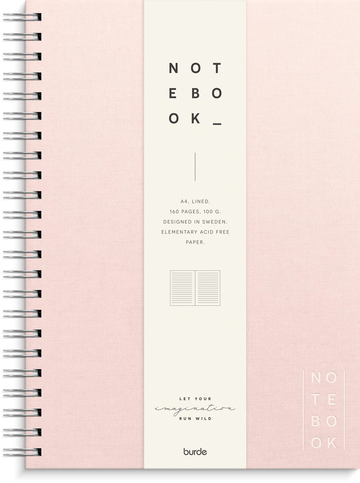 Format: A4. Layout: Linjerad. Omslag: Linnetextil. Spiralbunden. Antal sidor: 160. Pappersvikt: 100 g. Miljöinformation: FSC® papper. Varumärke: Burde.