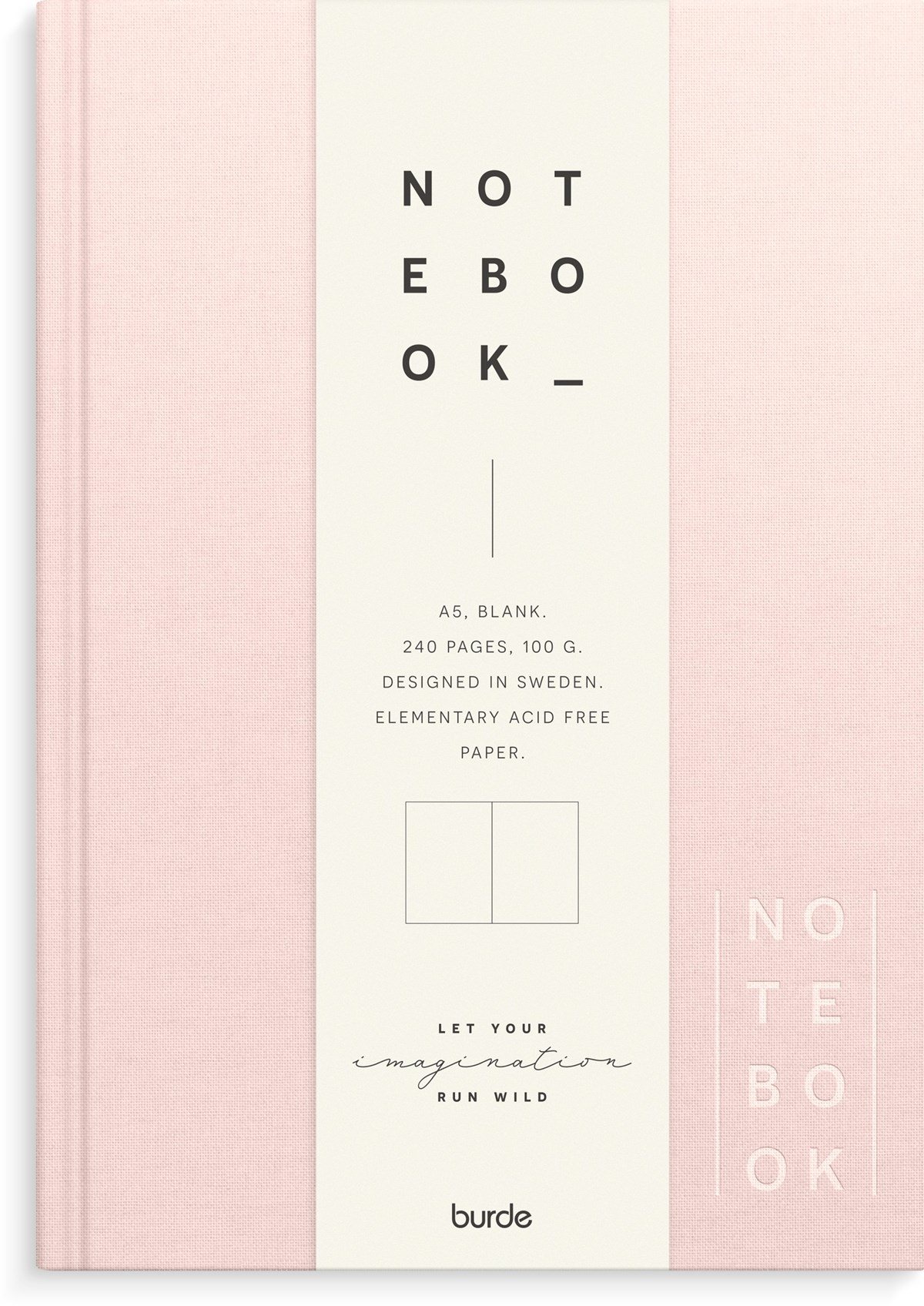 Format: A5. Layout: Olinjerad. Omslag: Linnetextil. Inbunden. Detaljer: Märkband. Antal sidor: 240. Pappersvikt: 100 g. Miljöinformation: FSC® papper. Varumärke: Burde.
