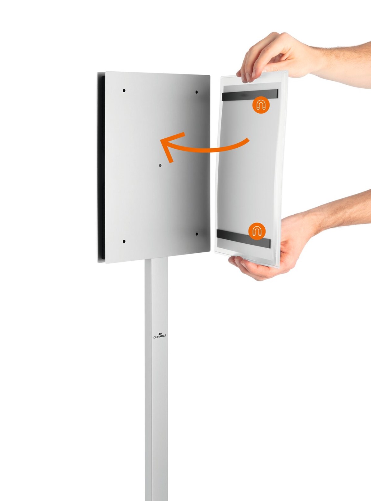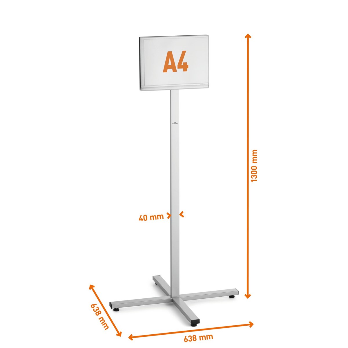 Korrosionsbeständigt stativ med stor fot som står stadigt, med möjlighet att tynga ner med sand eller vattensäckar i extra utsatta lägen. Innovativ snäppmekanism gör det möjligt att enkelt och utan hjälpmedel växla mellan stående och liggande format. Lämplig även för formatet US Letter. Det finns en mängd dokumentmallar finns på www.duraprint.se. Inklusive monteringssats och anvisning.