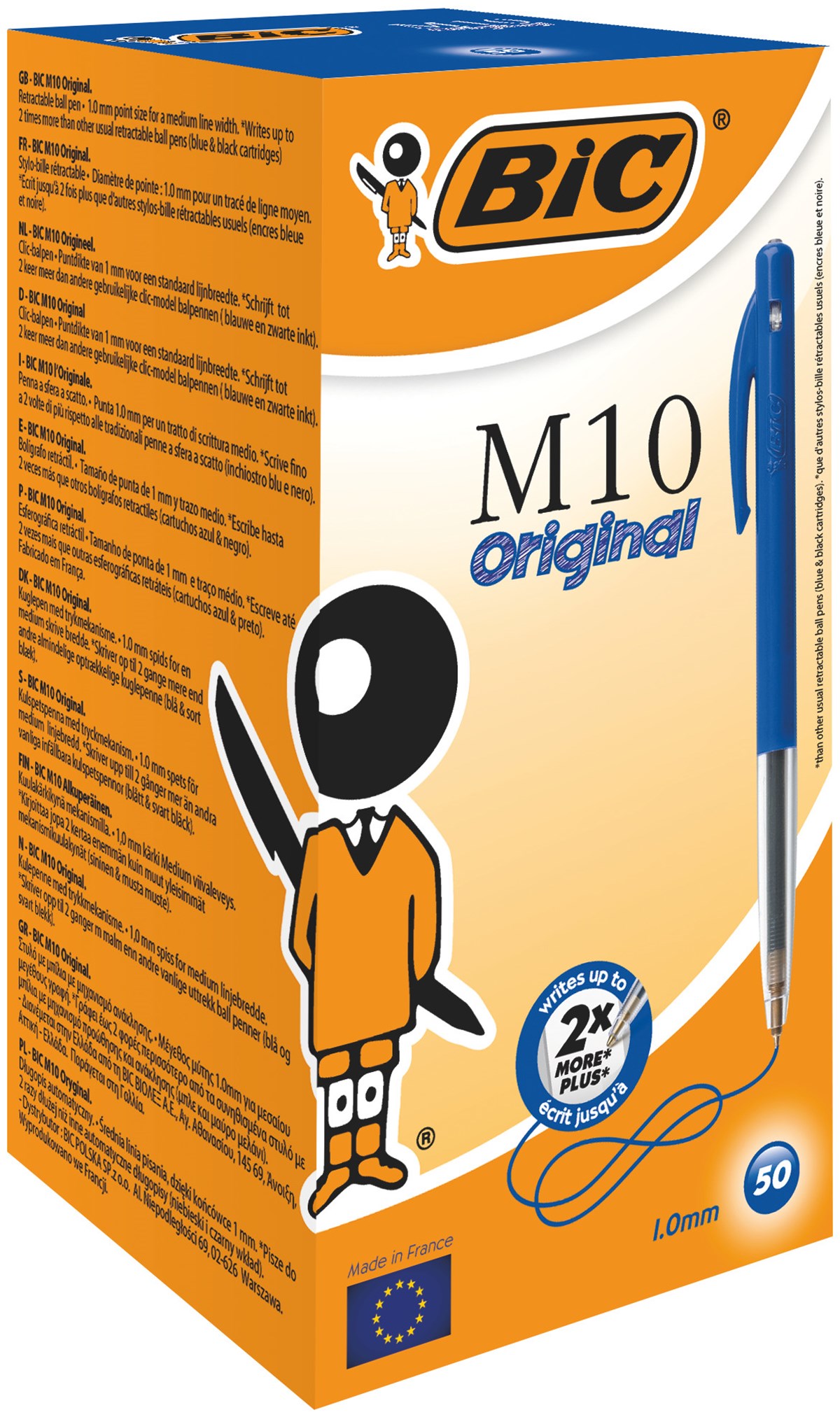 Klassisk kulspetspenna med tryckmekanism på sidan och räfflor runt greppet. Bläck i samma färg som pennkroppen. Kulbredd 1,0 mm, skrivbredd 0,4 mm. Skrivlängd ca 2000 m. Dokumentäkta bläck enligt ISO 12757-1 och 12757-2.